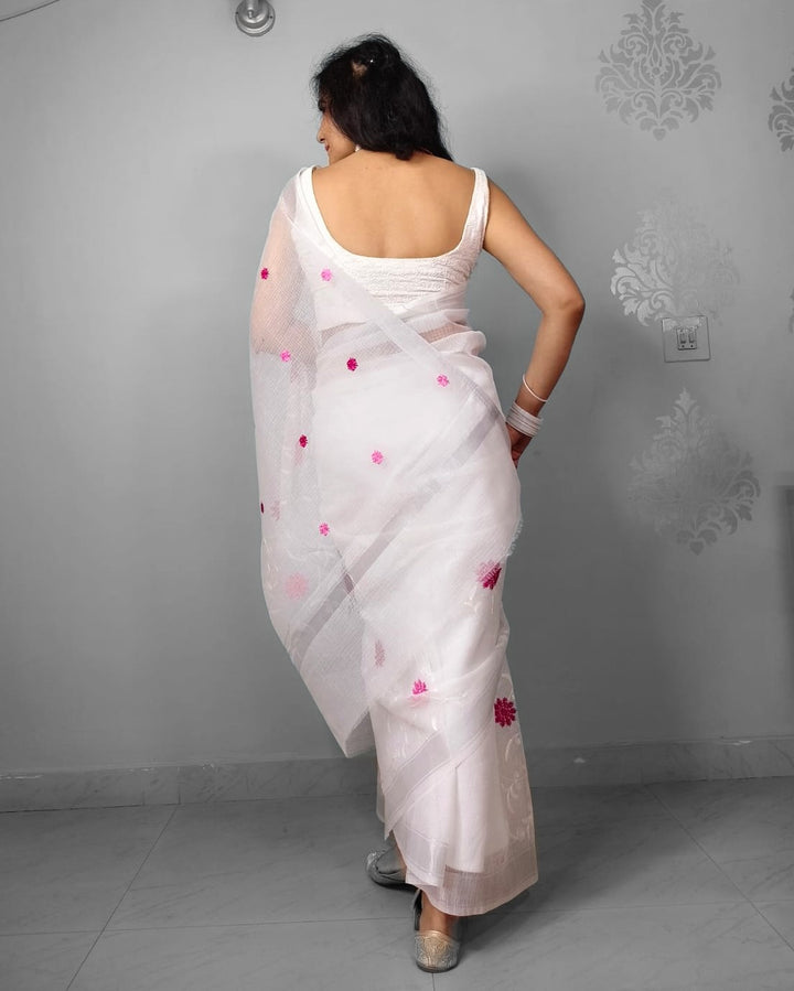 Laxmi- White Kota Doria Embroidery Work Saree, This Kota Doria Saree In Cotton Comes With Blouse.