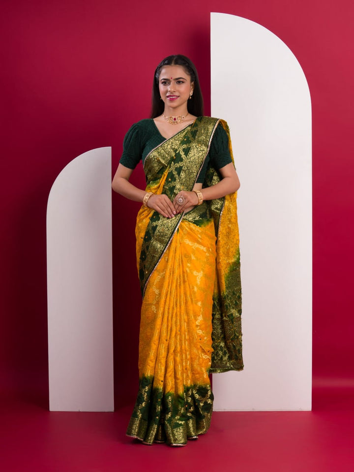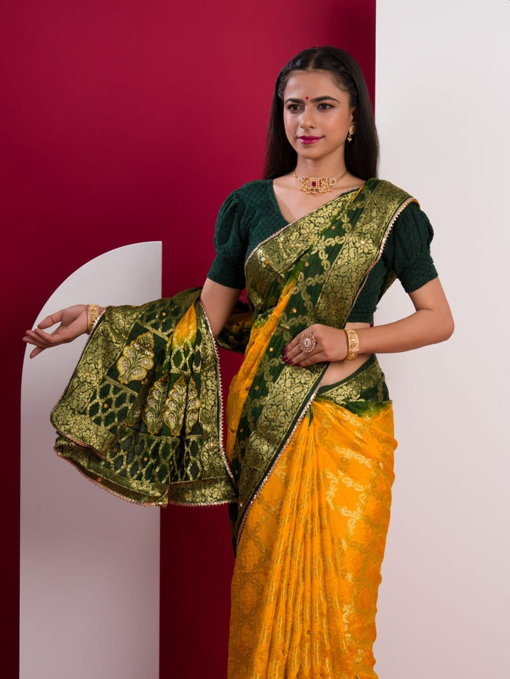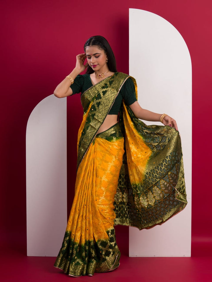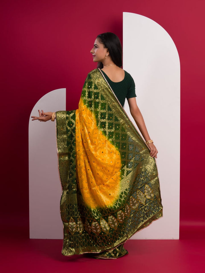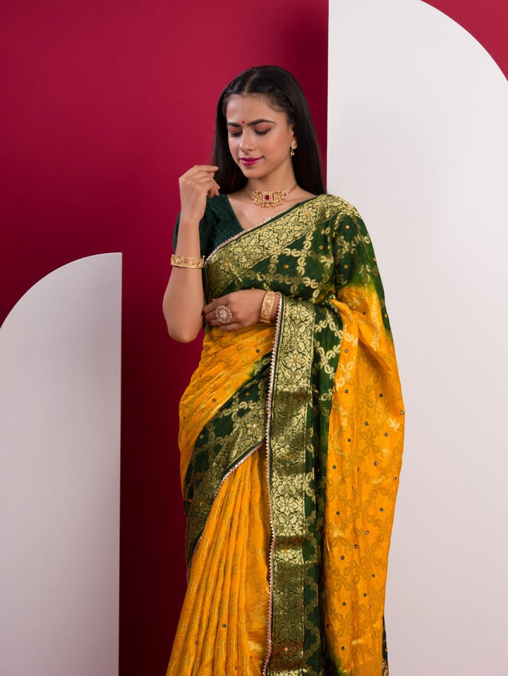 Yellow & Green Ghatchola Banarasee Silk Hand Mirror Work Saree