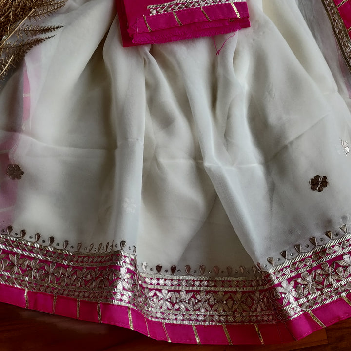 Shop Now This Cream Gota Patti Saree With Blouse.This Stunning Piece Features Handcrafted Gota Patti Flower Motifs All Over And Gota Patti Border. This cream Gota Work Saree Is Beautifully Handcrafted By The Our Talented Team Of Artisans. Shop This Look Now At Jhakhas.Com