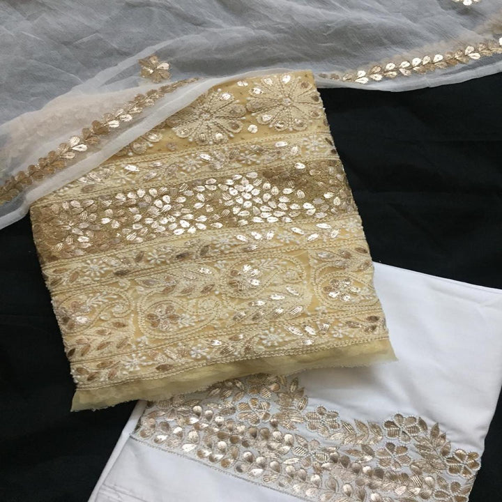 - Cream Gota Work Chikankari Salwar Kameez Set Unstitched