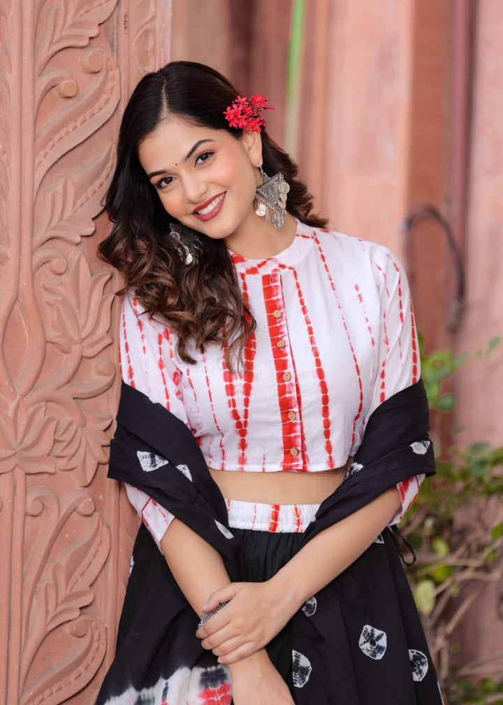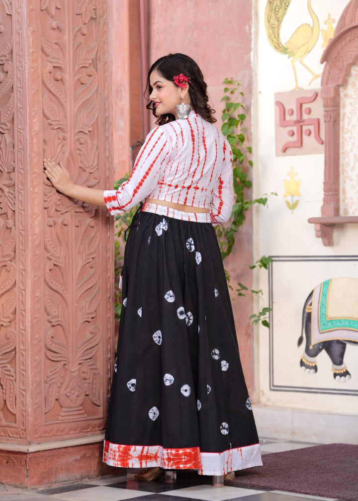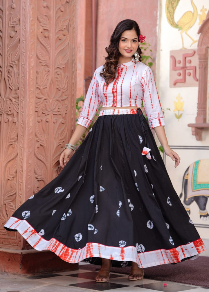 Black Bagru Hand Block Printed Designer Top & Skirt With Mulmul Dupatta.
