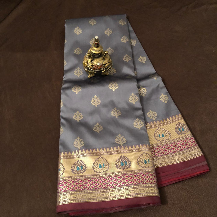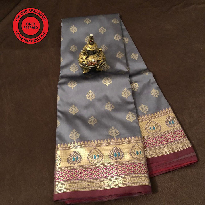 Dark Grey Upada Silk Saree Online At Best Price. This Banarasi Saree Has Beautiful Border And Boota In All Over Saree. This Banarasi Silk Saree Comes With Running/Contrast Blouse. This Silk Saree Is Perfect Wedding Saree,Karwachauth Saree, Diwali Saree Or Can Be Worn On Any Festival. Pair With Traditonal Kundan Jwellery And Look Gorgeous.