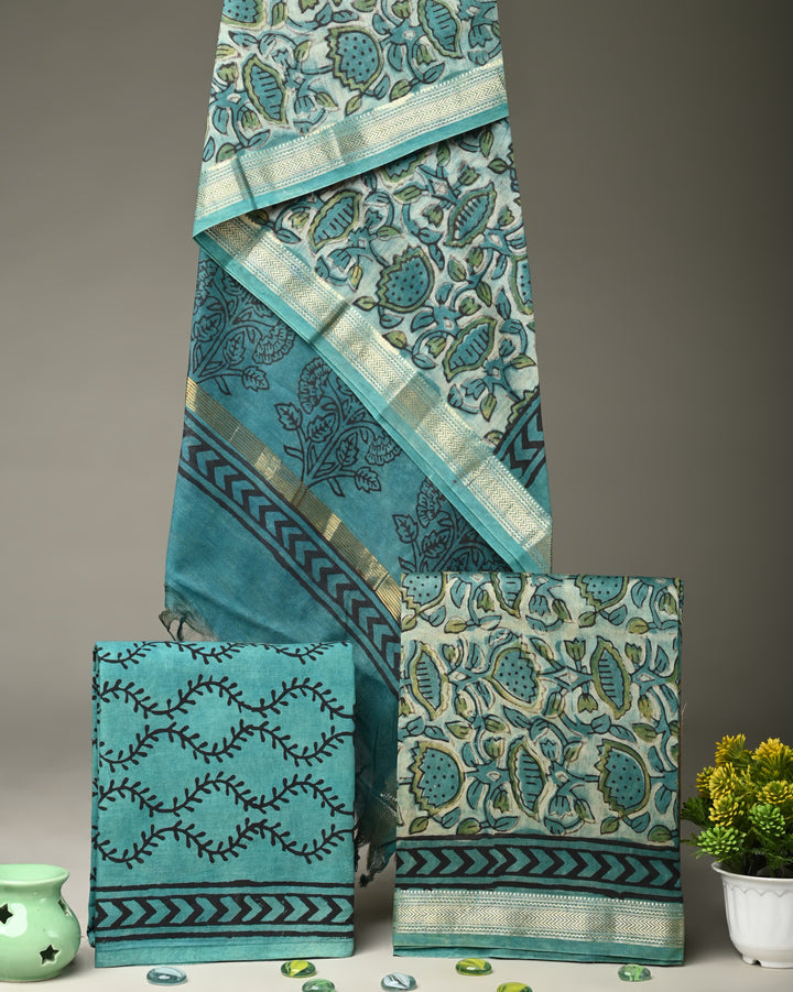 Sea Blue Maheshwari Silk Handblock Print Suit Material