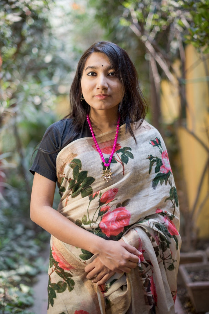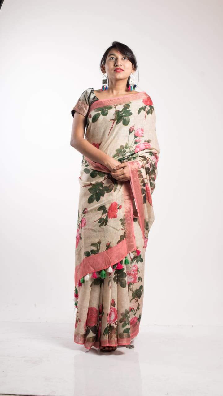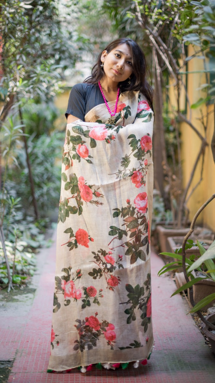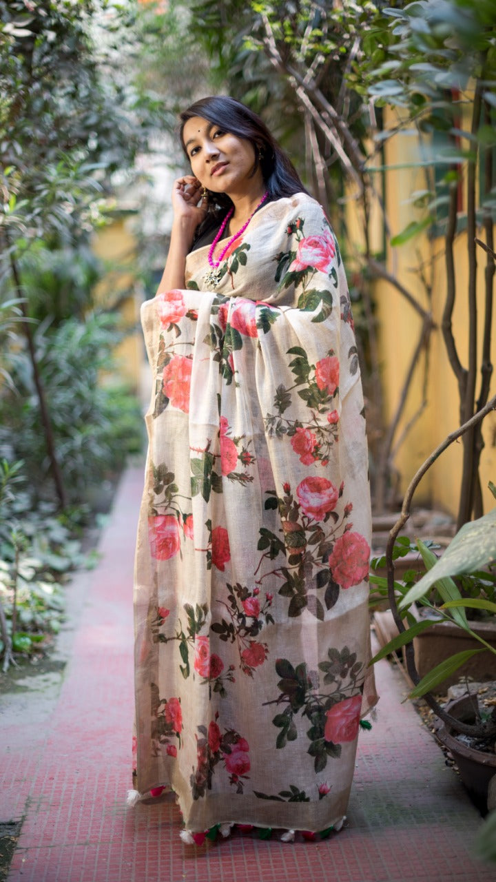 Digital Floral Print Linen Saree In Offwhite. Wear This Floral Linen Saree With Polki Neckpiece And Flaunt With Grace.