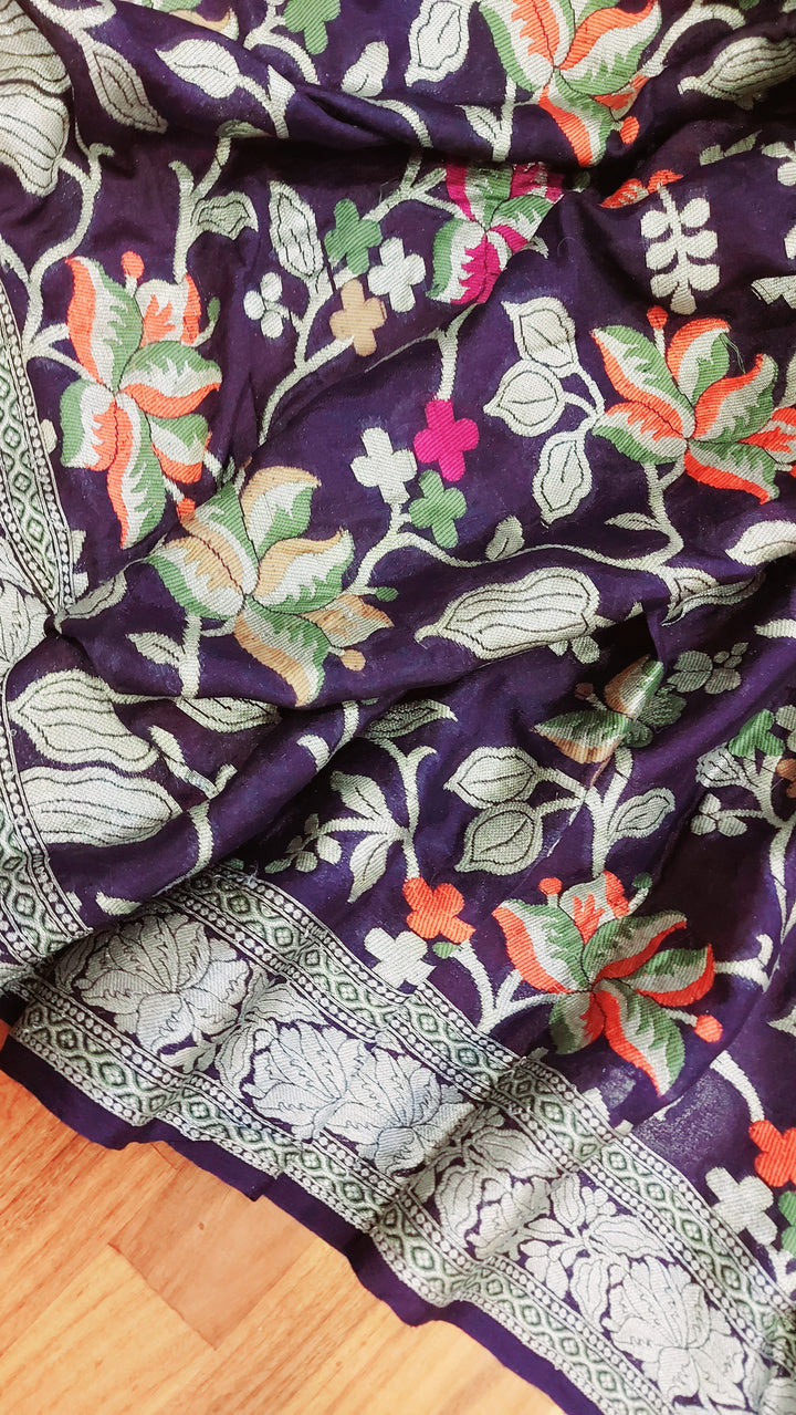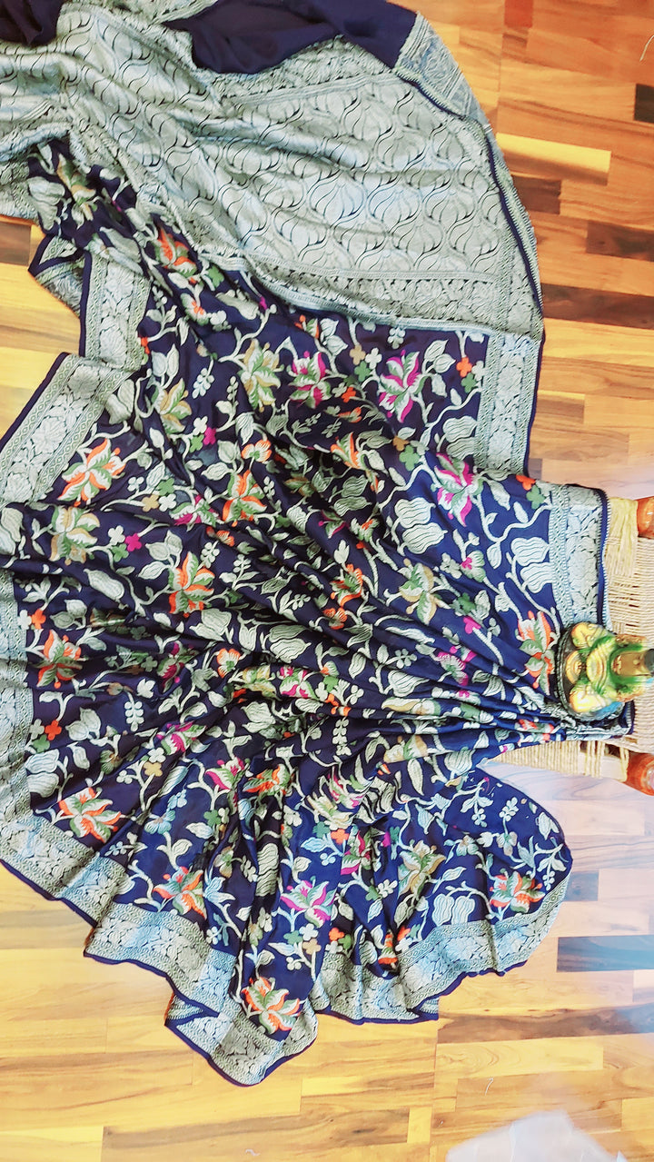 - Midnight Blue Floral Handloom Banarasi Khaddi Chiffon Meenakari Saree