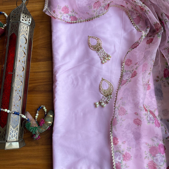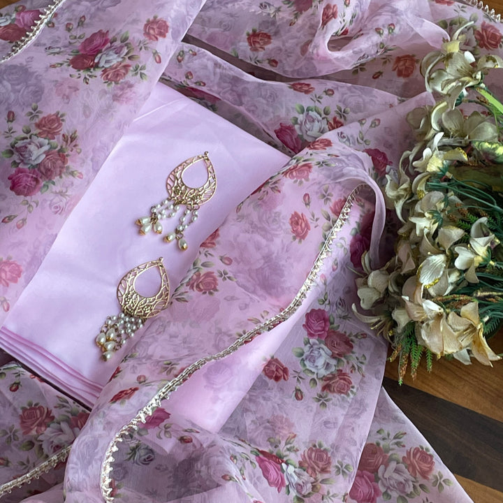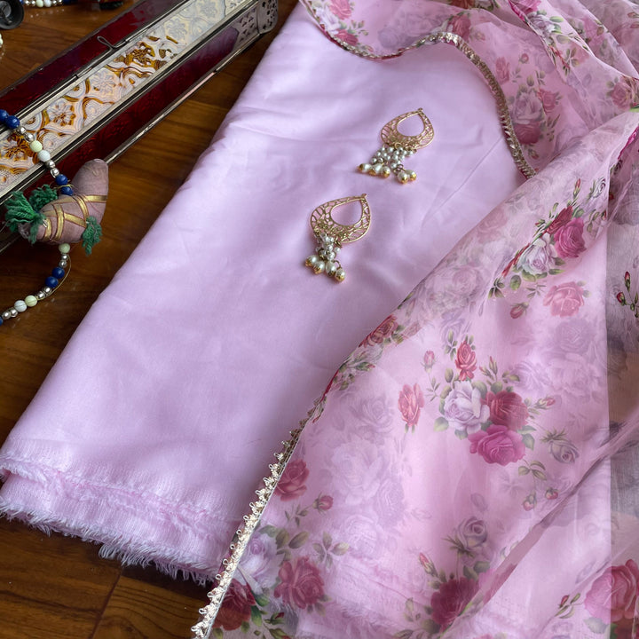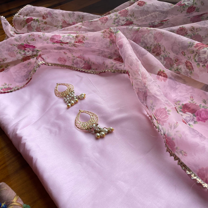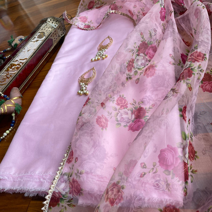 Get Now,This Pink Floral Organza Dupatta With Pink Plain Salwar Suit.This Designer Organza Suit Set Is Floral Printed All Over Dupatta.This Fancy Organza Salwar Suit Comes With 2.5 Mtr Fancy Top, 2.5 Mtr Designer Dupatta & 2.5 Mtr Plain Bottom.This Organza Fabric Suit Set Is Perfect For Haldi.