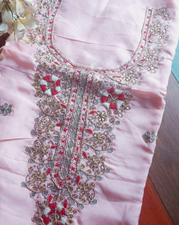 On hand embroidred sarees and suits there may be little variations in Colour or Embroidery due to hand dyed the hand embroiderd process of making each product unique and hence the shade tone may vary by 3-5% .