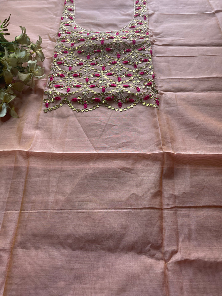 Make A Stunning Style Statement As You Head Out Wearing This Peach Gota Patti Kurti. This Peach Kurti Is Crafted In Cotton Silk Fabric. This Gorgeous Unstitched Kurti is Adorned With Stunning Gota Patti Work On Neckline. This Unstitched Fabric Can Be Styled According To Your Design.