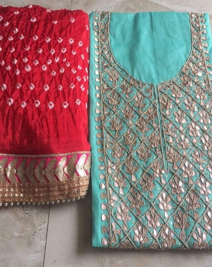 This powder Skyblue And Red gotapatti Salwar Suit by Jhakhas is crafted in Chanderi Cotton and comes attached with a Bandhej dupatta. Featuring a handwork on set, round neckline, 3/4th sleeves, this suit set offers a comfortable fit. Style this dress with a pair of stud earrings and a pair your heels to attain a casual look. Due to the handmade nature of our products there can be variations in colours.This Three Piece Salwar Suit Comes With Matching Bottom Of Dupatta Color, Each Fabric Is 2.5 Mtr Long. This Is Unstitched Salwar Suit And Comes With Jaipuri Gota Patti Hand Work On Top(2.5mtr) With Designer BandhejDupatta (2.5 mtr) Which Comes With Border. The Dress Material Comes With Bottom (2.5 mt) Matching dupatta color.