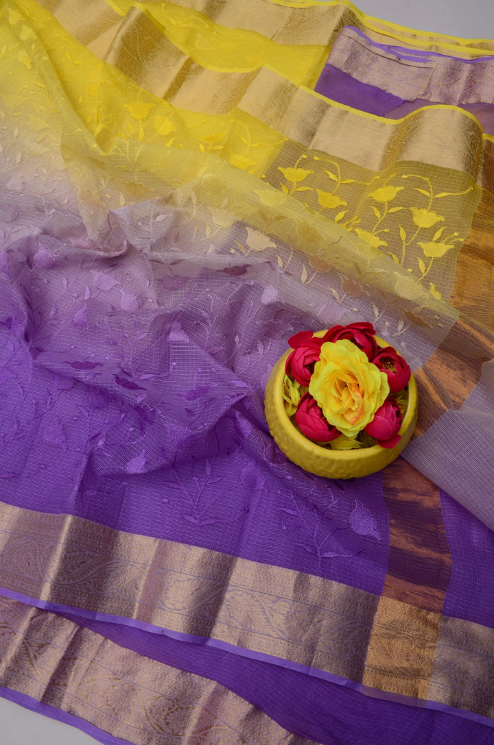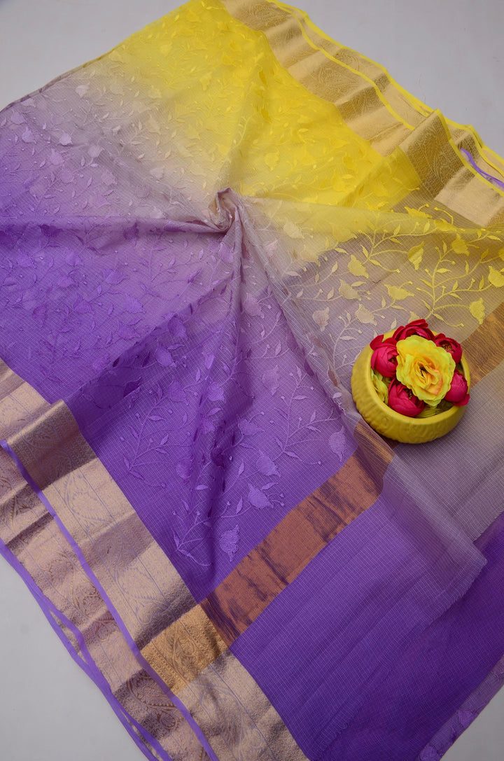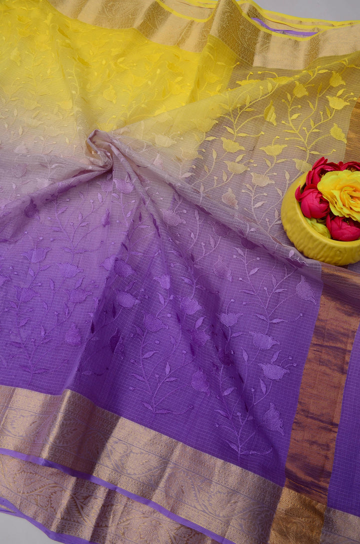 Charulata- Yellow And Purple Kota Doria All Over Embroidery Work Saree