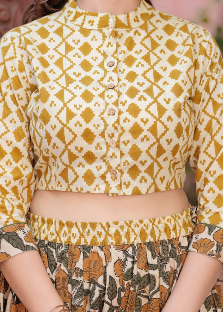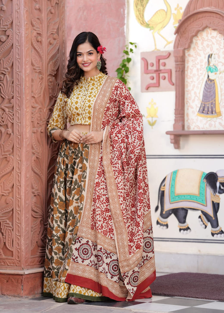 Green Bagru Hand Block Printed Designer Top & Skirt With Mulmul Dupatta.