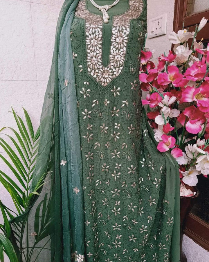 - “Suhana” Forest Green Lucknowi Chikankari Gota Patti Salwar Suit Fabric