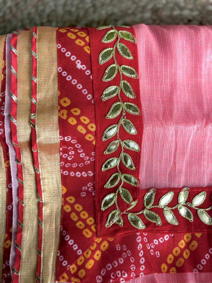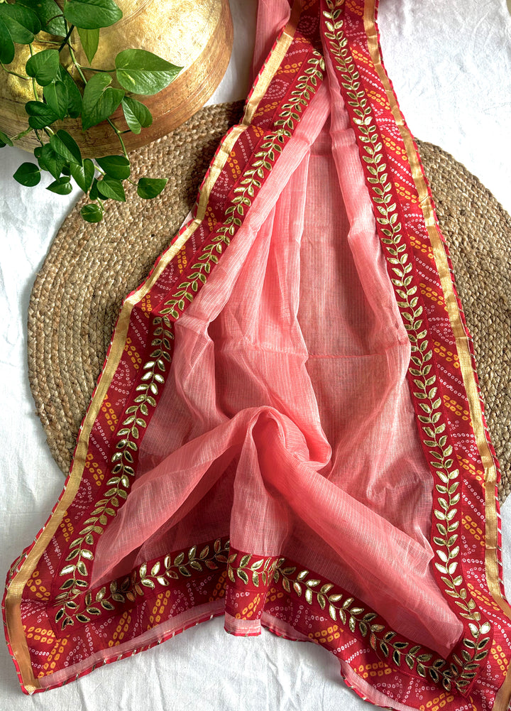 Peach colour Kota Doria Gota Patti Saree Comes With Blouse. The Saree Comes With Designer Gota Patti Work On Border And Boota. Wear This Kota Doria Saree as Casual Meeting Saree Or Kitty Party Saree. Saree Length - 6.5 Mtr With Blouse.