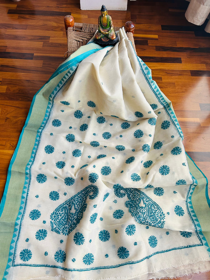 Kalpana- Green Cream Color Kota Doria Chikankari Work Saree