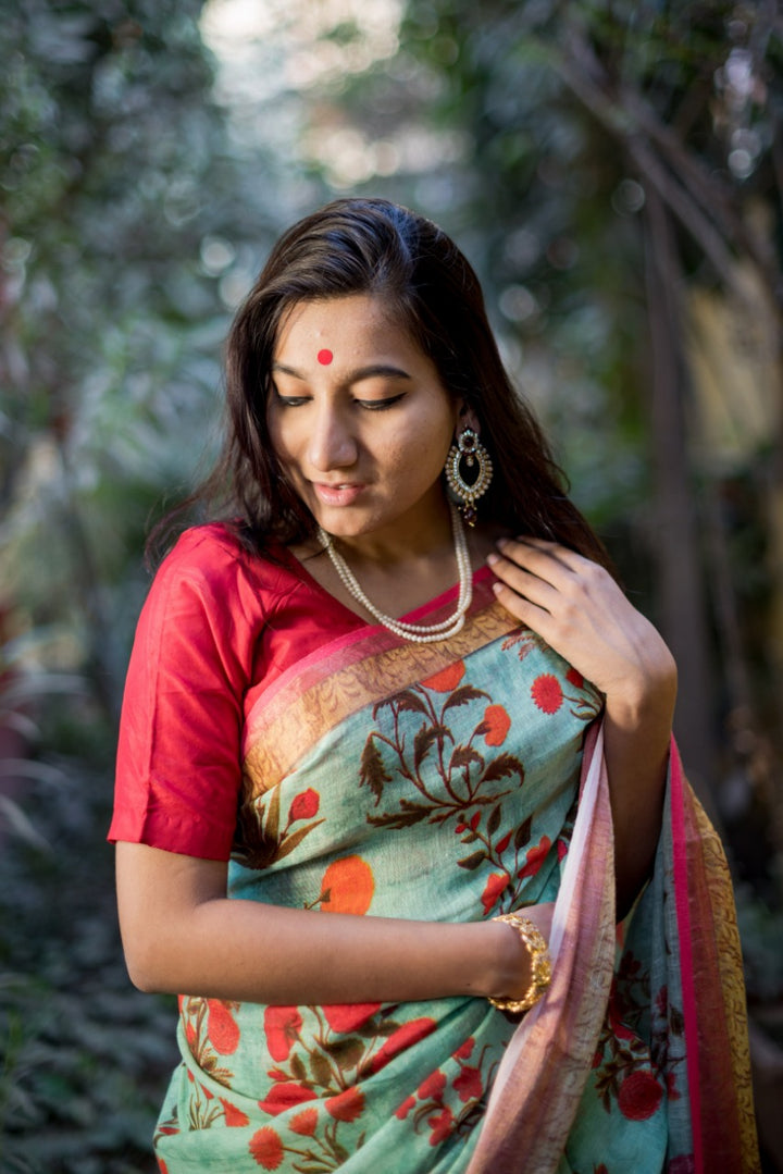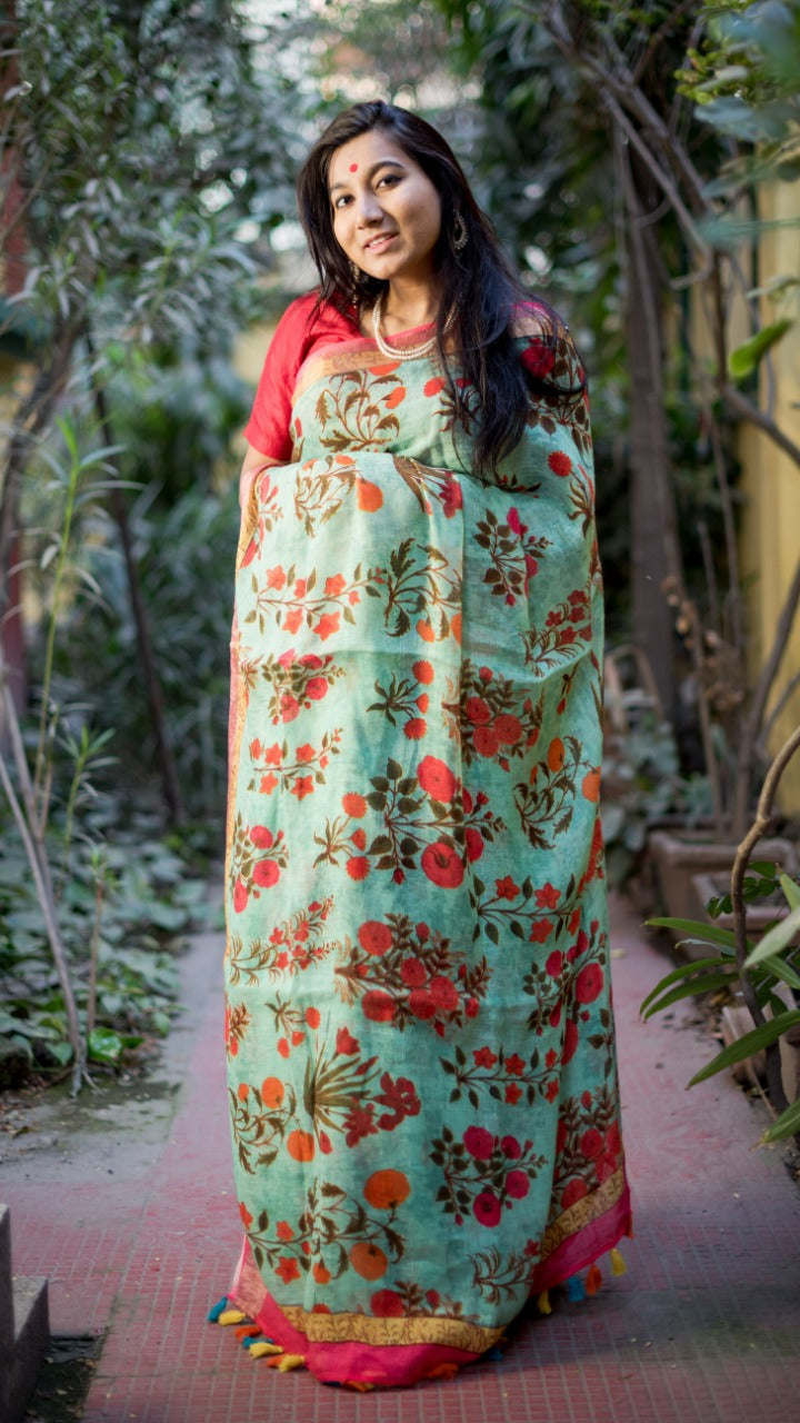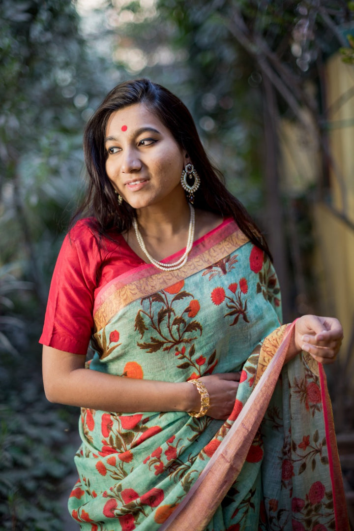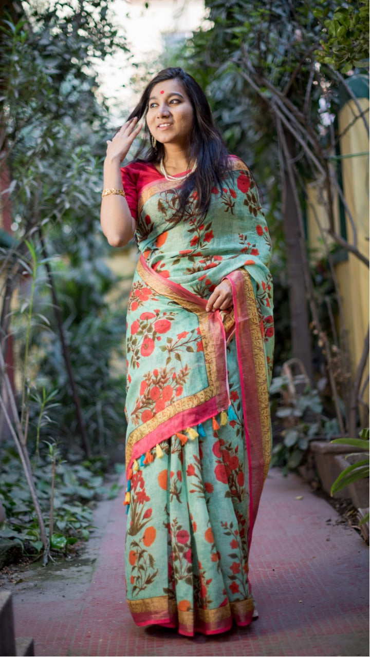 This Beautiful Green Digital Print Linen Saree Is Sure To Turn Heads. This Pure Linen Digital Print Saree Will Be The Showstopper. Easy To Drape And Carry Our Kota Doria Saree Comes With Matching Blouse To Styled As Per Your Design.