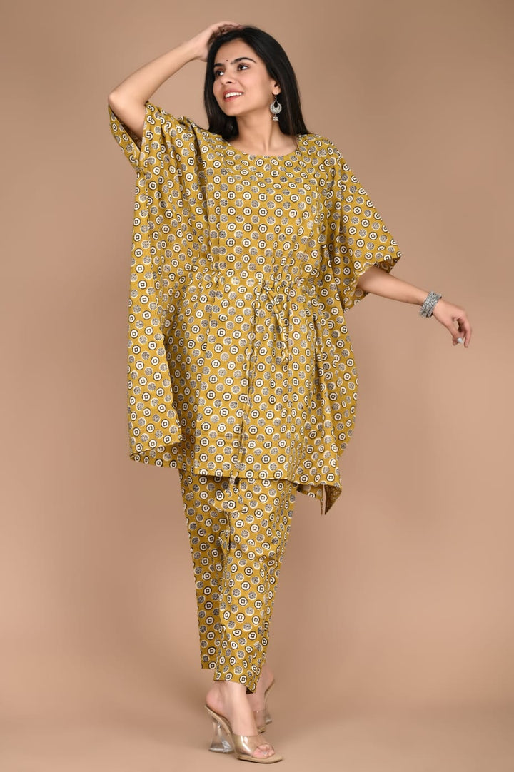 Amp up your fashion quotient with this Green Printed Cotton Kaftan with Pants Set. The Green cotton kaftan comes with all-over prints, a round neckline, elbow-length sleeves, and a front tie-up detailing.