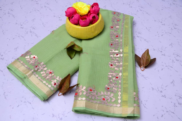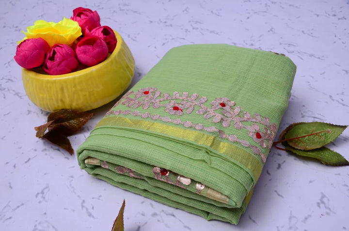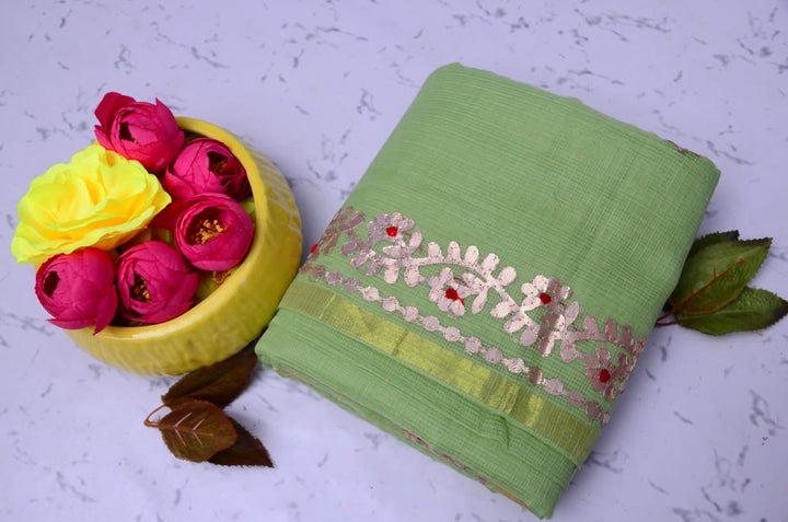 Karni- Green Kota Doria Saree in Gota WorkComes With Blouse. The Saree Comes With Designer Gota Patti Work On Border And Boota. Wear This Kota Doria Saree as Casual Meeting Saree Or Kitty Party Saree. Saree Length - 6.5 Mtr With Blouse.