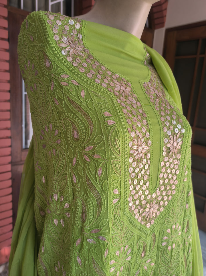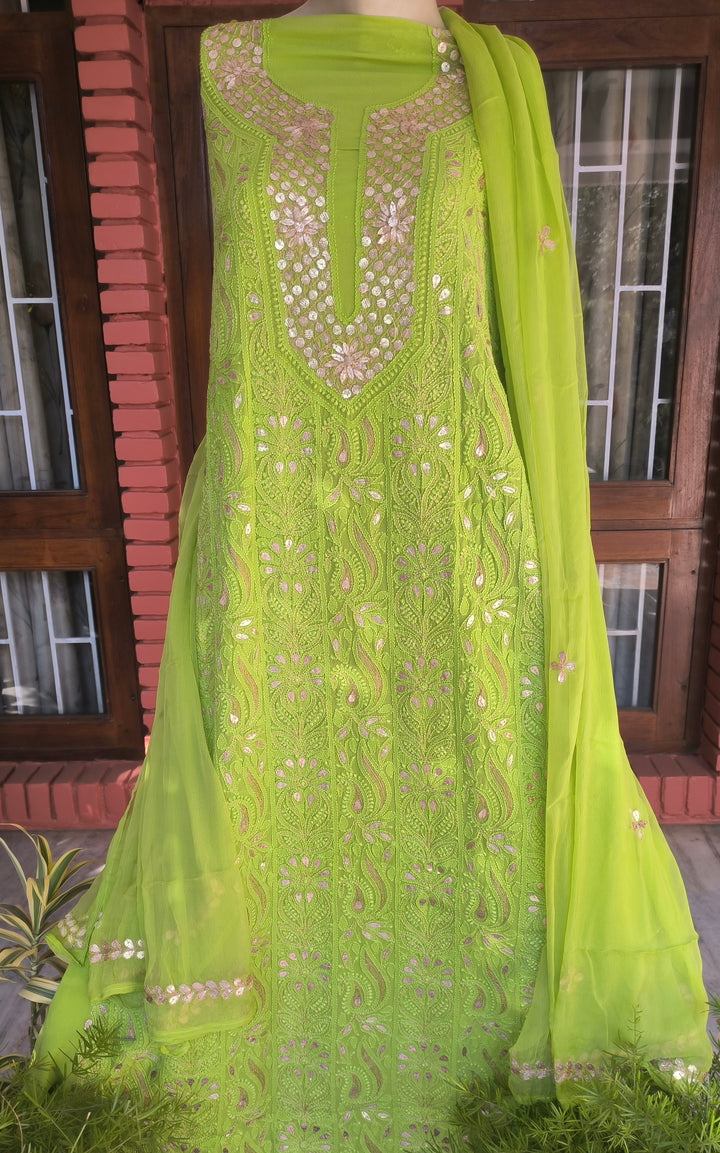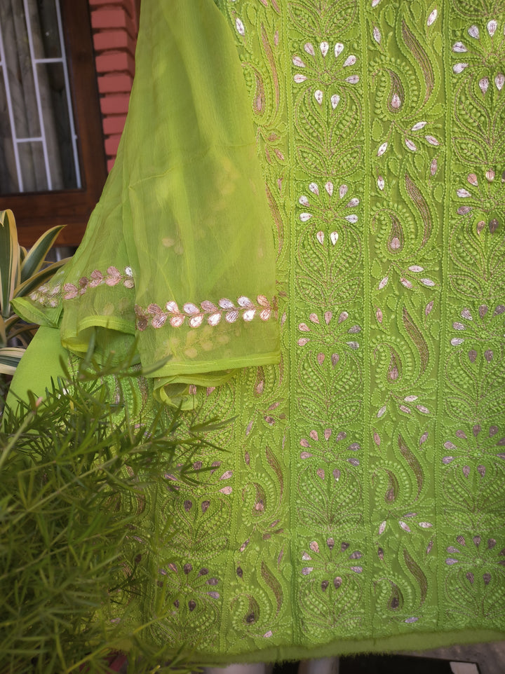 “Zarshabz” Green Lucknowi Chikankari Gota Patti Salwar Suit(Dress Material)