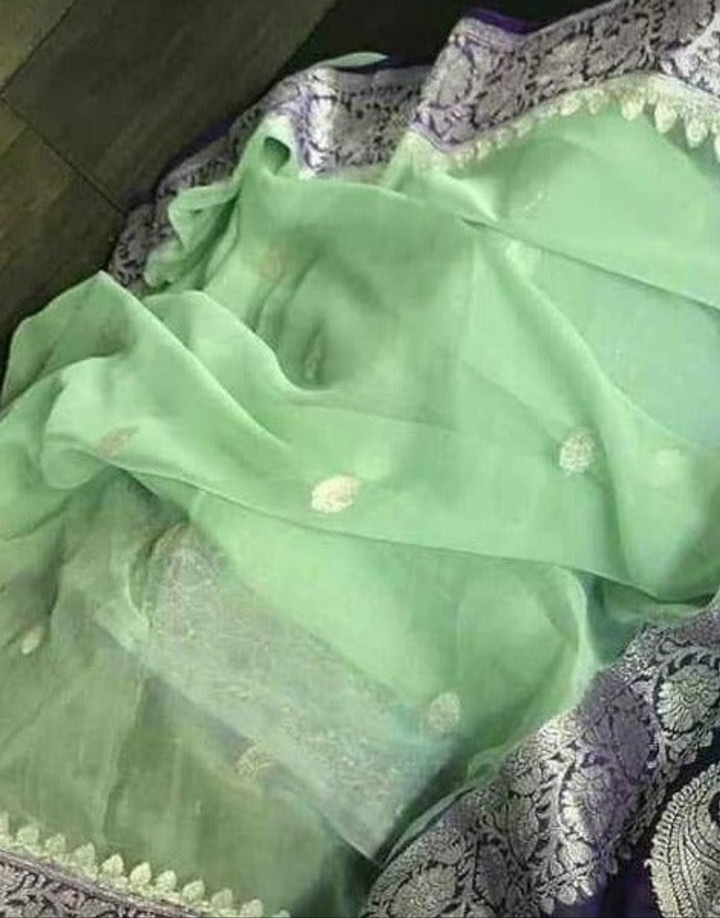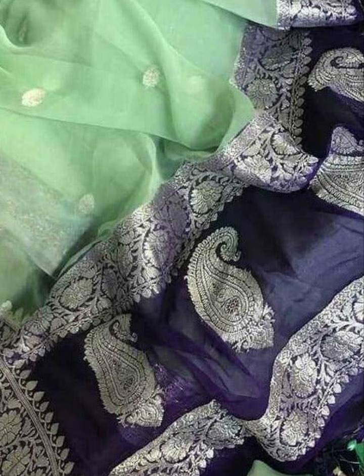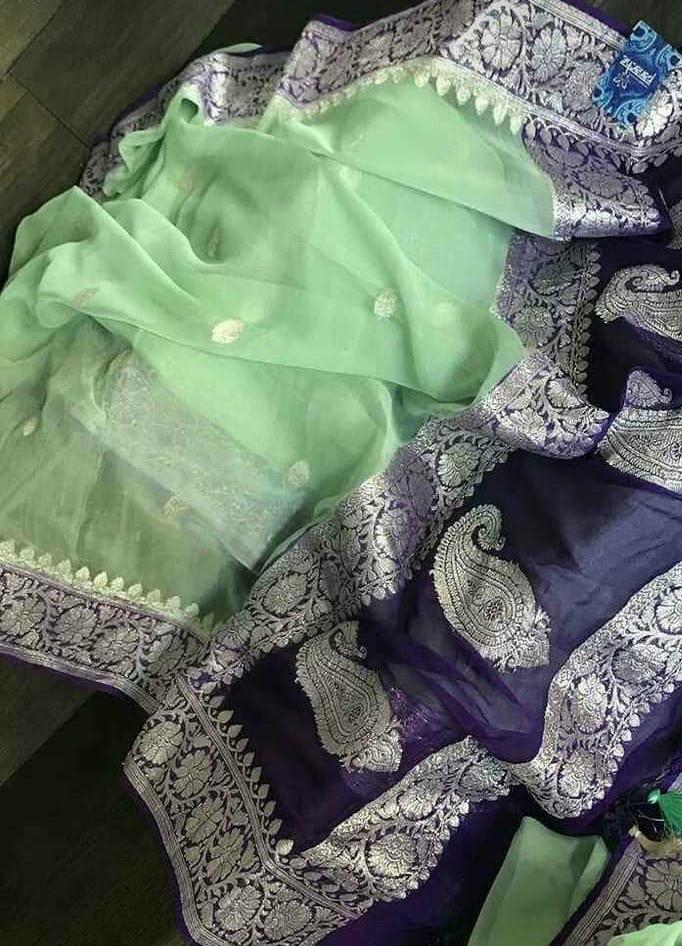 Mint Green Navy Blue Banarasi Georgette Jaal Saree