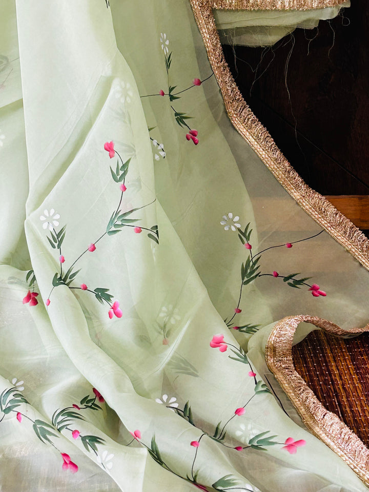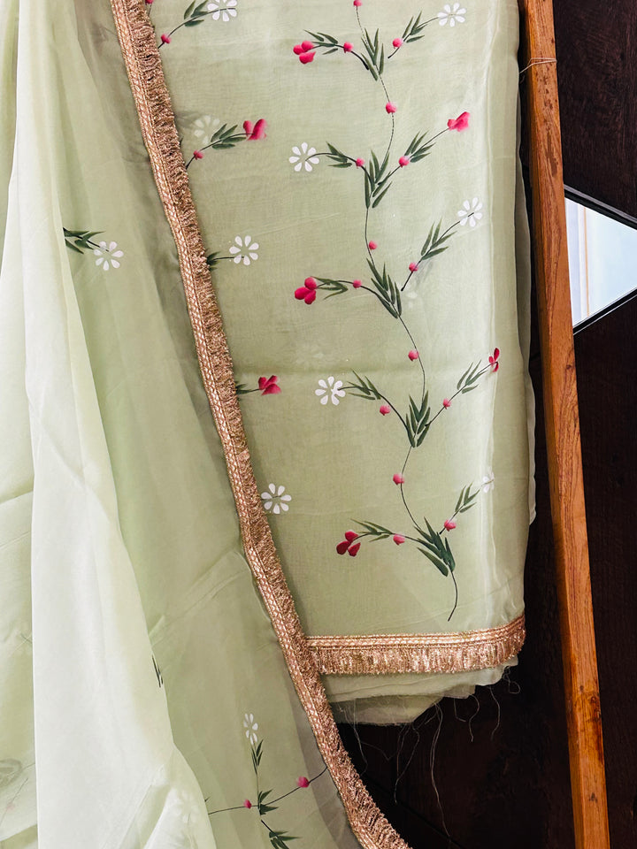 Grab Now,This hand painted Salwar Suit.This Trendy Organza Salwar Kameez Comes With 2.5 Mtr Fancy Top, 2.5 Mtr Designer Dupatta & 2.5 Mtr Plain Bottom.This Organza Suit Set Is Perfect For Styling.This Floral Organza Salwar Suit Having All Over Floral Print On Dupatta Which Perfect For any festival day.
