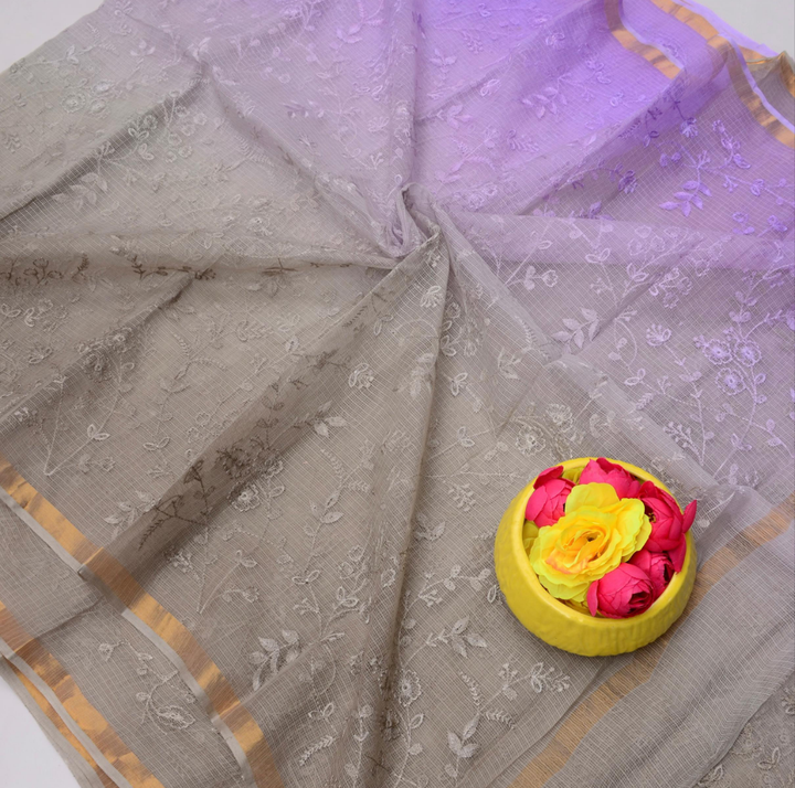 Kanchan- Grey & Light Purple Kota Doria Embroidery Work Saree