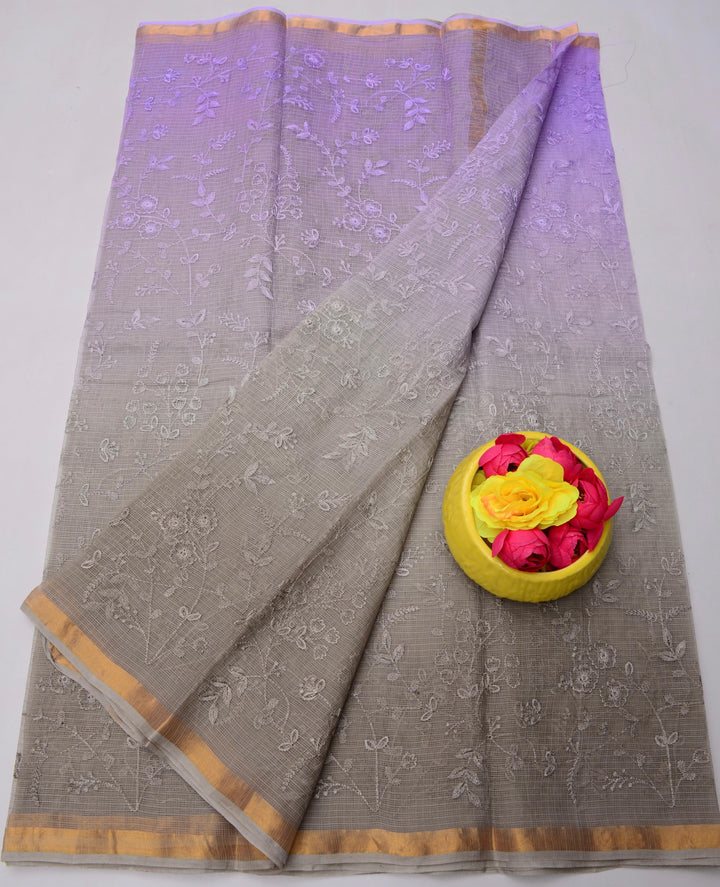 Kanchan- Grey & Light Purple Kota Doria Embroidery Work Saree, This Kota Doria Saree In Cotton Comes With Blouse.Wear This Kota Doria Saree as Office Wear Saree, Daily Wear Saree Or Kitty Party Saree. Saree Length - 6.5 Mtr With Blouse.