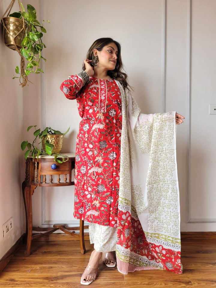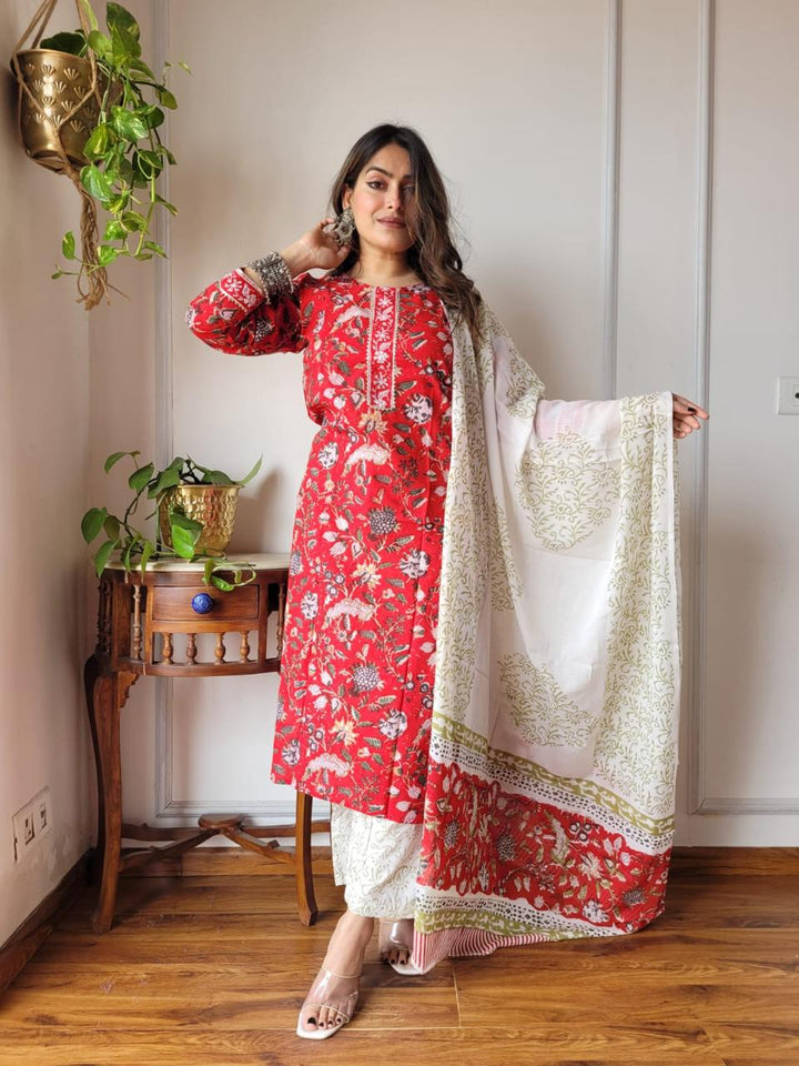 Make some space in your casual wardrobe for this cotton red colored kurti pant set with a dupatta. Comes with a Cotton bottom and a Cotton dupatta with tassels. Women can buy this set to wear for their casual wear, office wear, and weekend get-together. This Beautiful set will surely fetch you compliments for your rich sense of style.