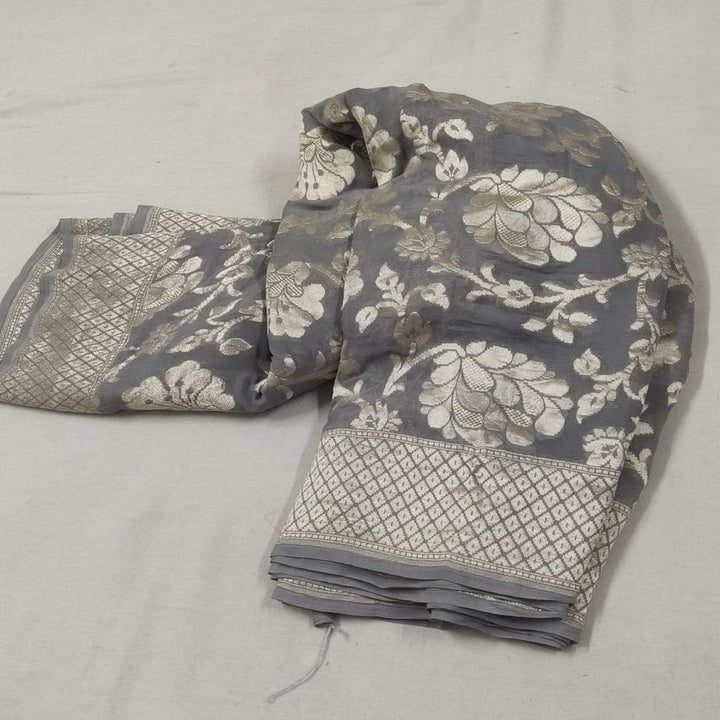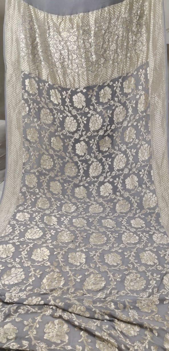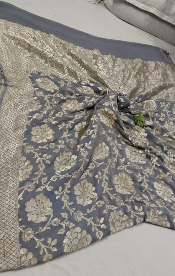 - Designer Steel Grey Floral Jaal Pure Banarasi Khaddi Georgette Saree