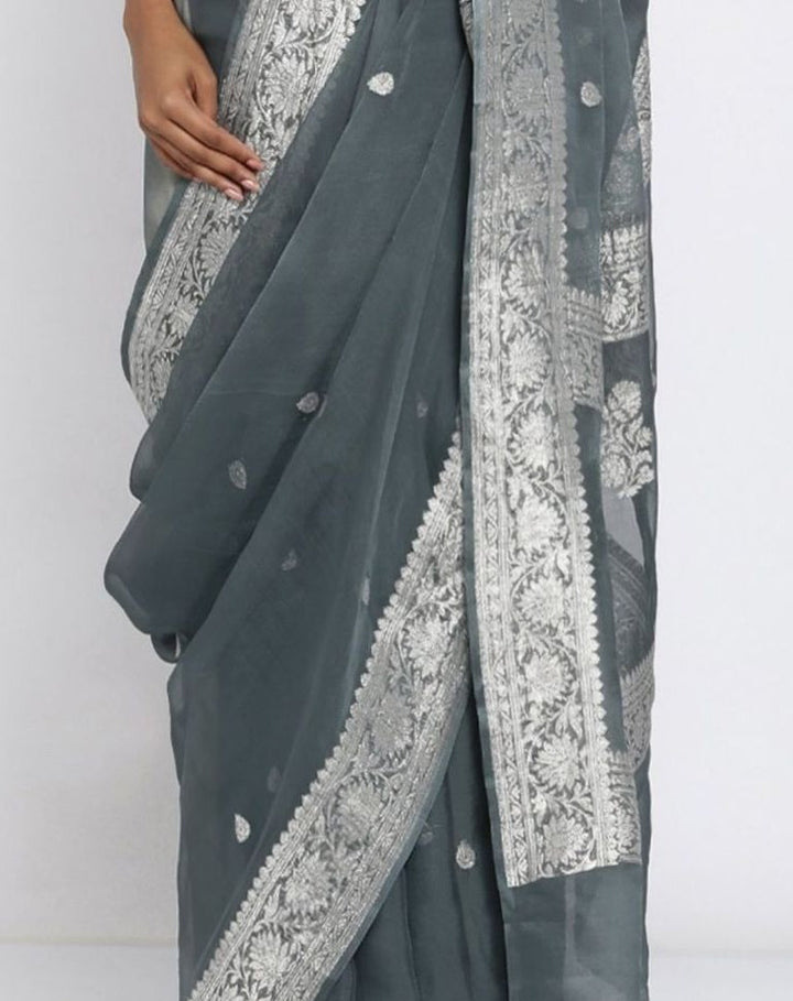 - Designer Snow Grey Jaal Pure Banarasi Khaddi Georgette Saree