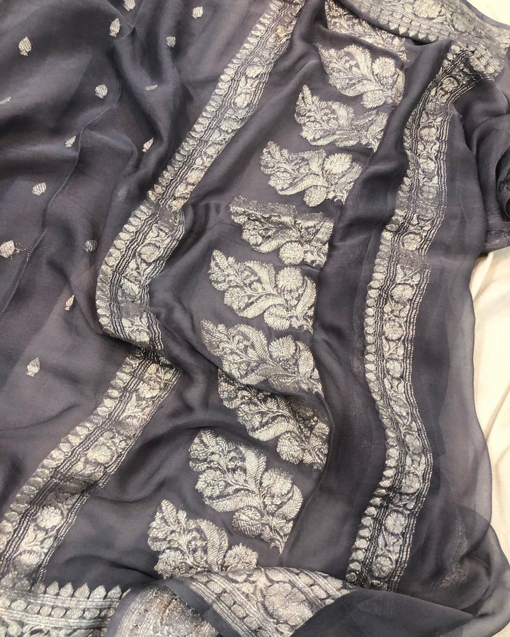 Snow Grey Banarsi Jaal Khaddi Chiffon Saree