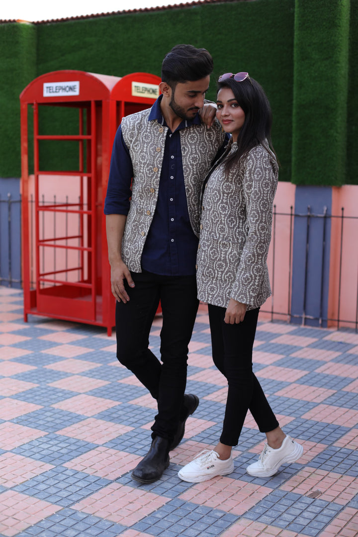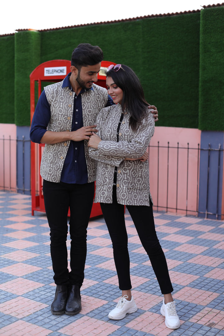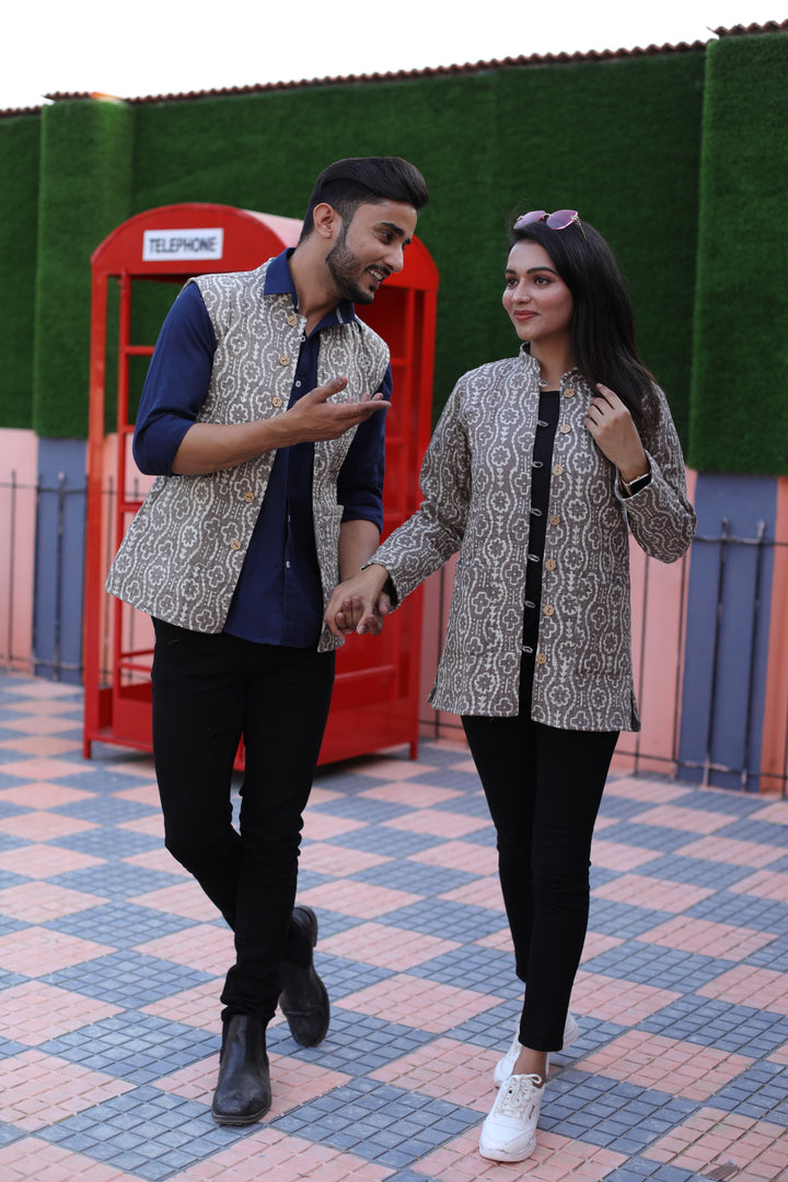 Brown Color Twinning Couple Pure Cotton Bagru Print Quilted Reversible Jackets