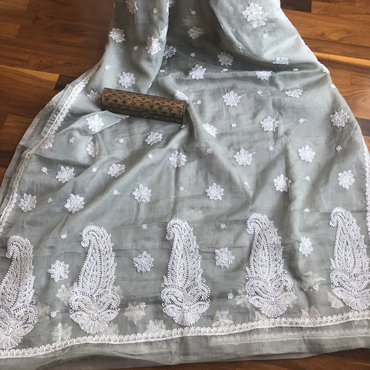 Shop Now Organza Chikankari Saree In Grey , Shop This Authentic And Pure Chikankari Saree For The Gorgeous Look. The Organza Fabric With Awesome White Thread Work On Whole Saree With Beautiful Pallu With Handwoven Chikankari Bootas And Small Chikankari Bootas On Whole Blouse. Pair With Awesome Rustic Jwel Like Neck Piece Or Ear Rings For The Perfect Look.Saree Comes With 6.6 Mtr With Blouce As Shown In The Picture