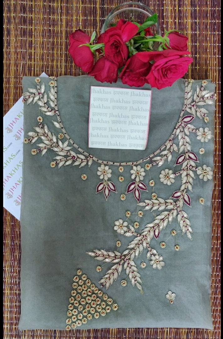 Make A Stunning Style Statement As You Head Out Wearing This Grey Gota Patti Organza Kurti. Makes A Stylish Addition To Your Traditional Closet. This Grey Gota Patti Organza Kurti Is Adorned With Beautiful Gota Patti Work On Neckline.