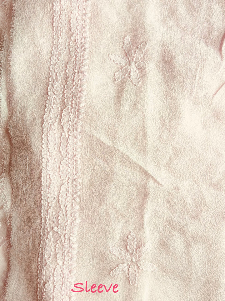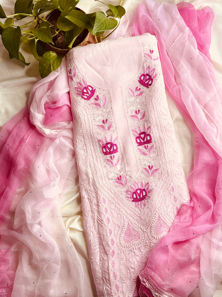 Unstiched 3 Piece Chikankari Dress Material. Top 3 mtr pure viscose georgette Top , Dupatta 2.5 mtr chiffon , Bottom 2.5 mtr shantoon (matching top color)