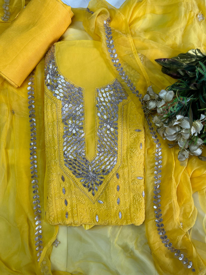 - Aftab – Bright Yellow Lucknowi Chikankari Gota Patti Salwar Kameez Dress Material