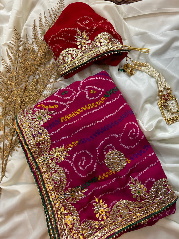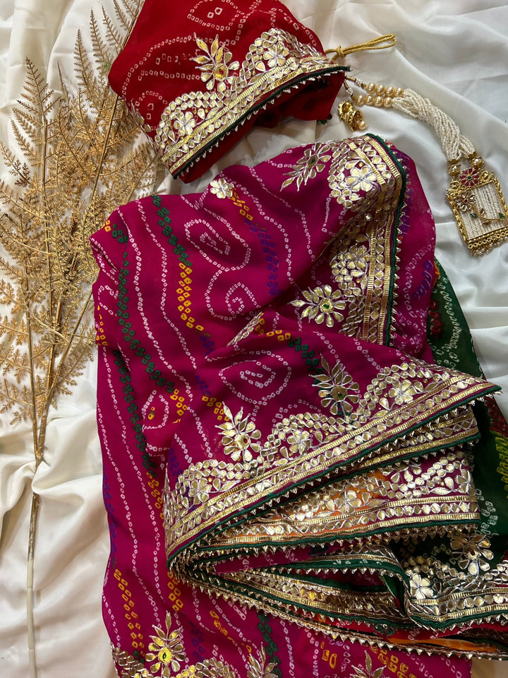 From The Land Of Rajasthan We Bring To You This Exquisite Hand Crafted Hot Pink Georgette Bandhej Gota Patti Work Saree. This Bandhej Gota Patti Saree With A Unique Gota Patti Work Make It A Must Have For Your Closet. Shop More Leheriya , Mothra And Bandhej Gota Patti Sarees At Jhakhas.Com.