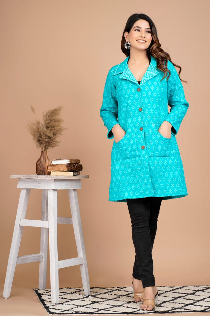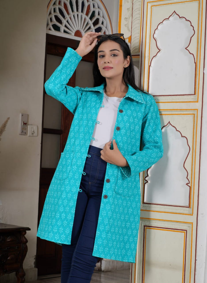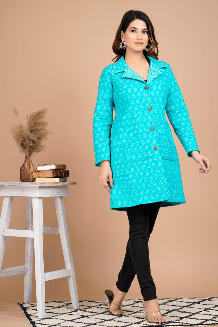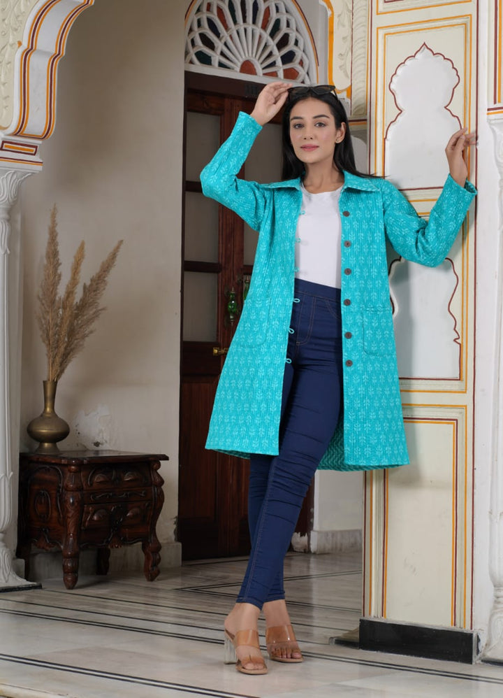 Beautiful Blue Pure Cotton Quilted Reversible Print Long Jackets