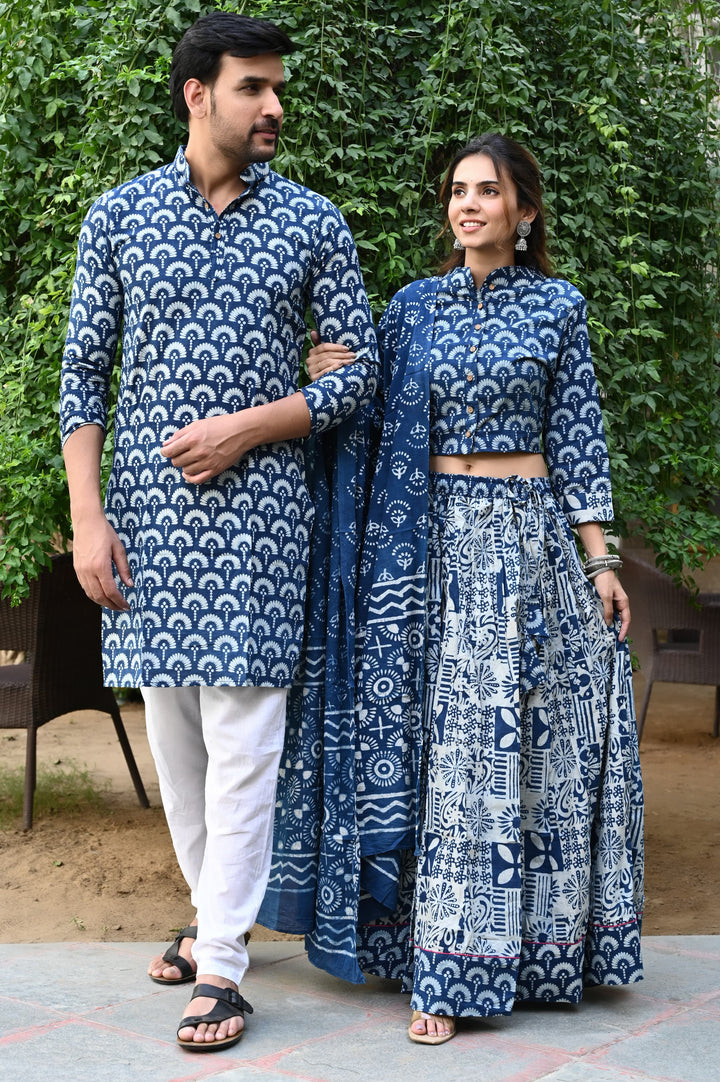 Indigo Pure Cotton Twinning Couple Set In Block Print