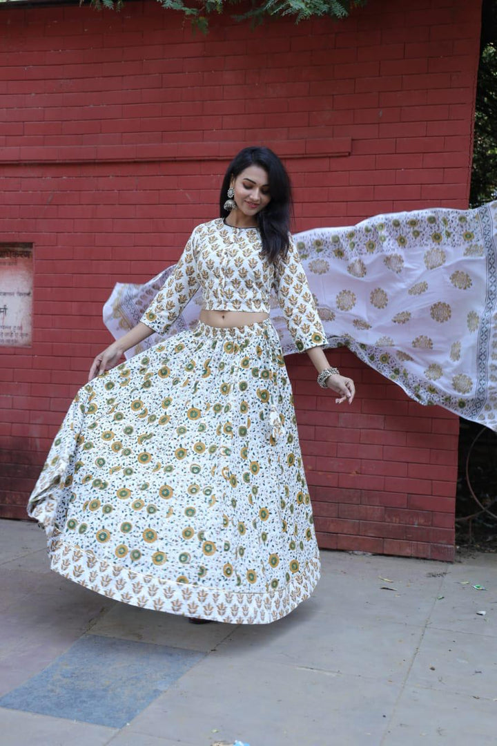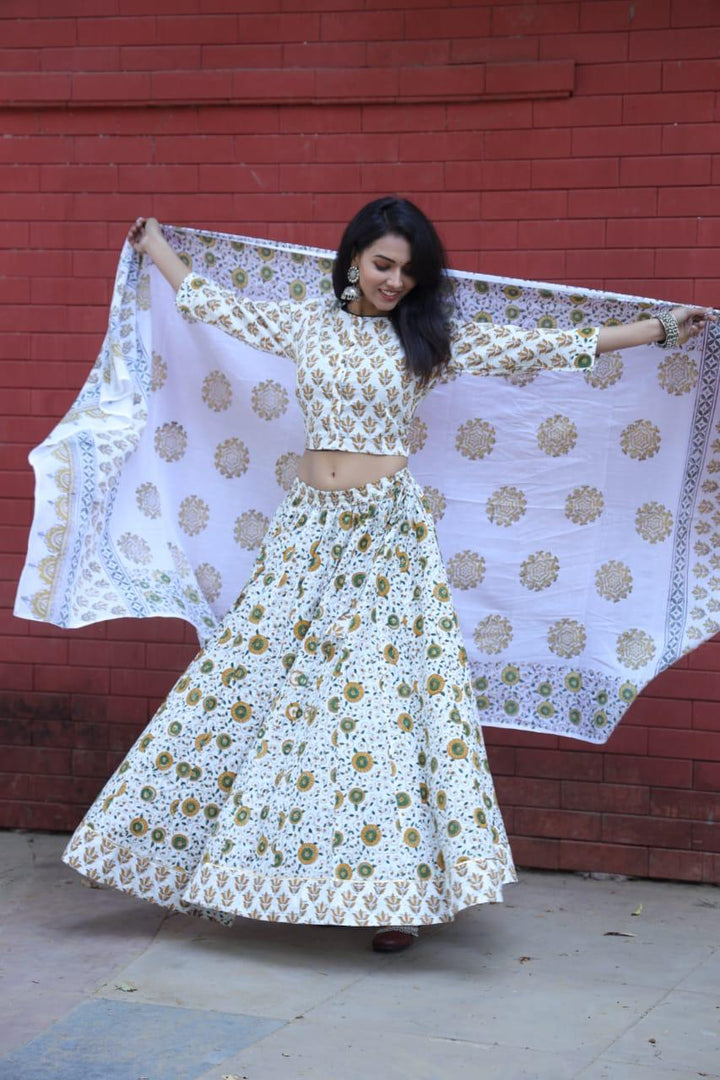 Off white Bagru Hand Block Printed Designer Top & Skirt With Mulmul Dupatta.