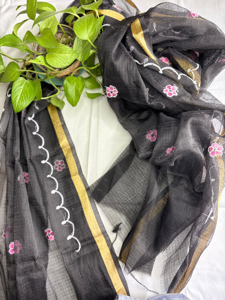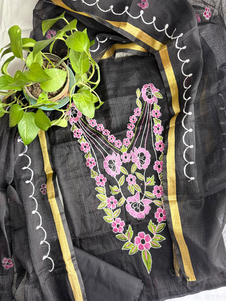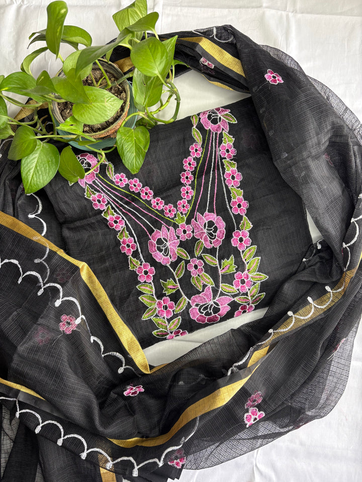 Kota Doria Embroidered Suit Set In black Comes With 3 Pieces Suit 2.5 Mtr Top In Kota ,2.5 Mtr Dupatta In Kota,2.5 Mtr Bottom In Cotton. You Can Carry Beautiful Natural Stone Earrings With It. This Kota Doria Suit Has Beautiful Work Done By Our Karigars.,Free Shipping And Cod Available, Shipping Worldwide.