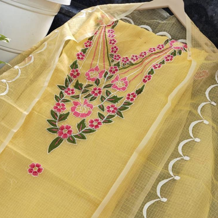 Kota Doria Embroidered Suit Set In Yellow Comes With 3 Pieces Suit 2.5 Mtr Top In Kota ,2.5 Mtr Dupatta In Kota,2.5 Mtr Bottom In Cotton. You Can Carry Beautiful Natural Stone Earrings With It. This Kota Doria Suit Has Beautiful Work Done By Our Karigars.,Free Shipping And Cod Available, Shipping Worldwide.