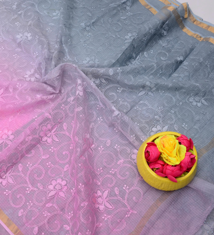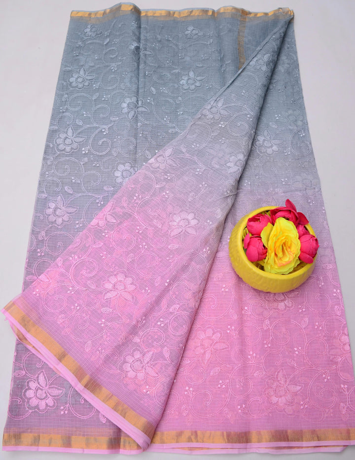 Phoolmati- Pink & Grey Kota Doria Embroidery Work Saree