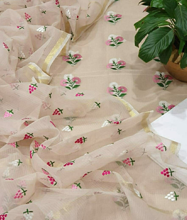 Beautiful Kota Doriya Embroidery Work Suit In Cream Comes With 3 Pieces Suit 2.5 Mtr Top In Kota ,2.5 Mtr Dupatta In Kota,2.5 Mtr Bottom In Cotton. You Can Carry Beautiful Natural Stone Earrings With It. This Kota Doria Suit Has Beautiful Work Done By Our Karigars.,Free Shipping And Cod Available, Shipping Worldwide.