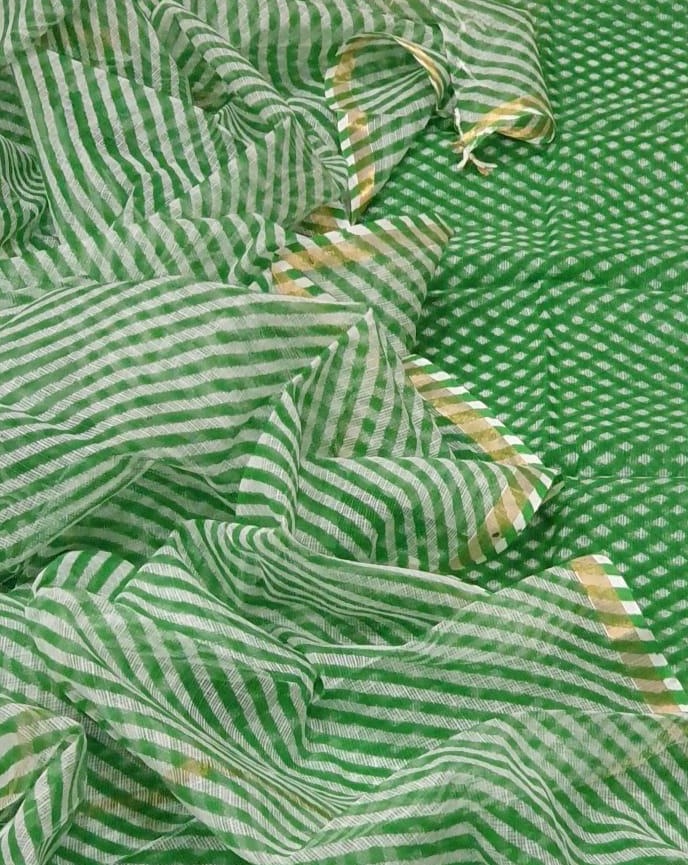 Leheriya Kota Doriya dupatta Suit In Green Comes With 3 Pieces Suit 2.5 Mtr Top In Kota checks ,2.5 Mtr leheriya Dupatta In Kota,2.5 Mtr Bottom In Cotton. You Can Carry Beautiful Natural Stone Earrings With It. This Kota Doria Suit Has Beautiful Work Done By Our Karigars.,Free Shipping And Cod Available, Shipping Worldwide.