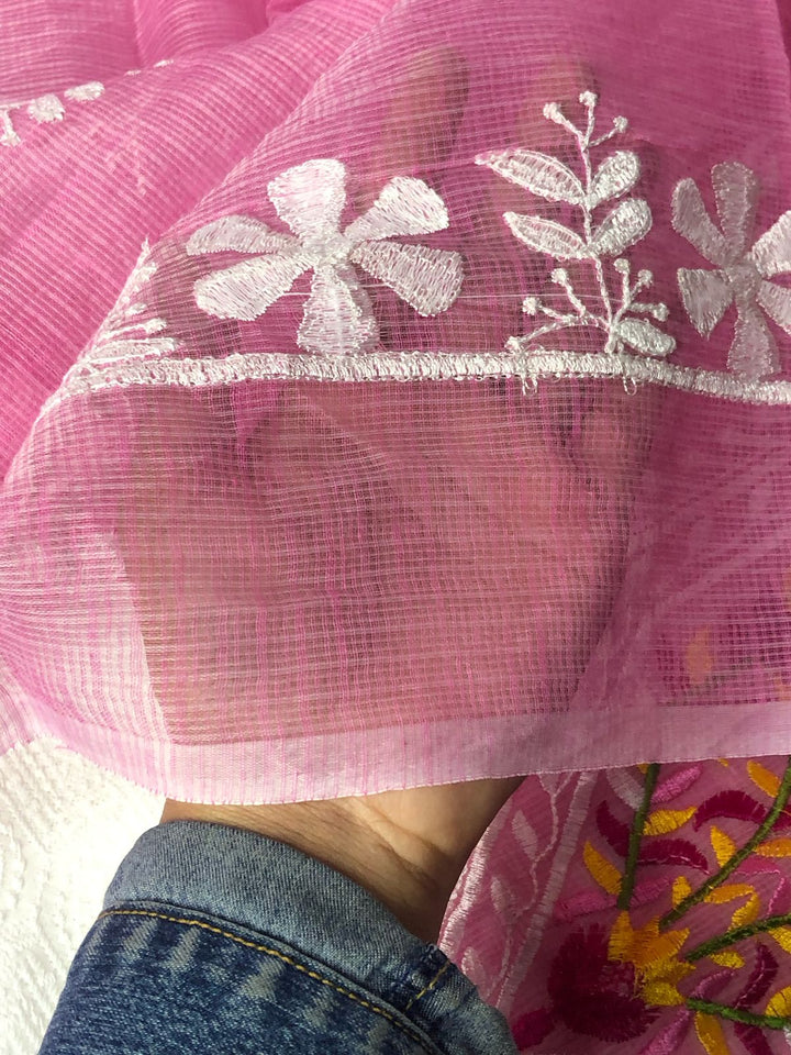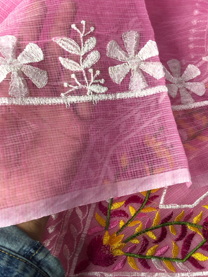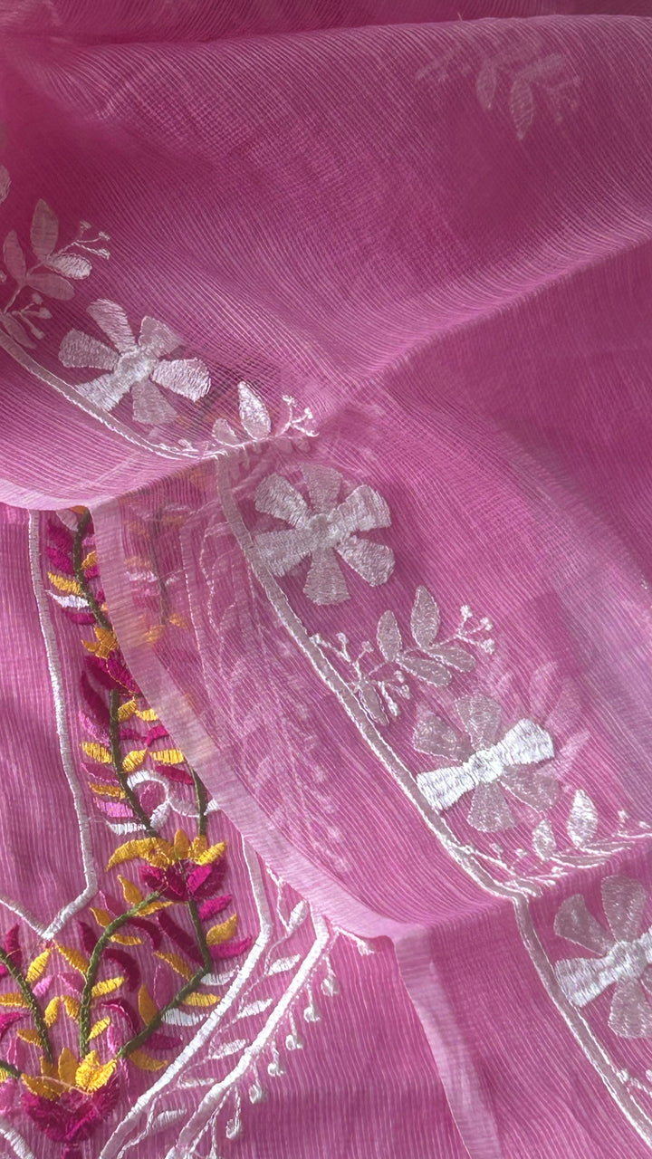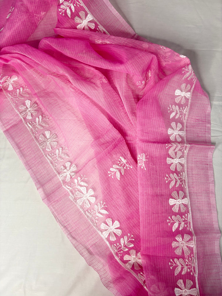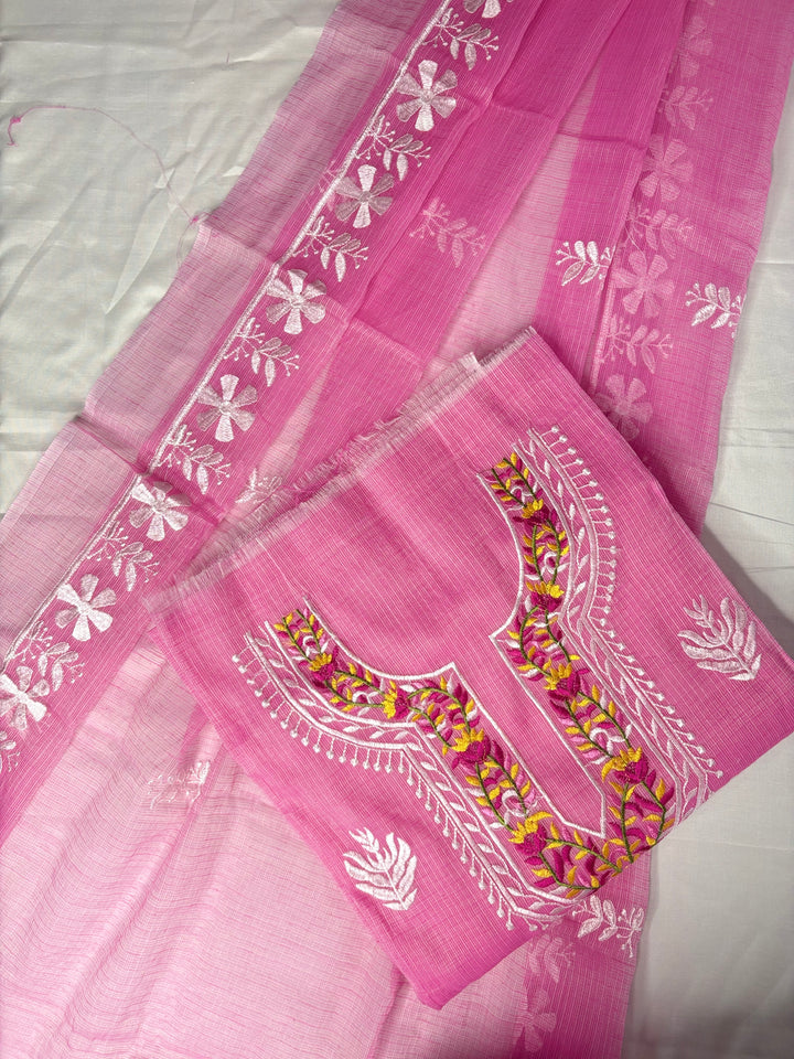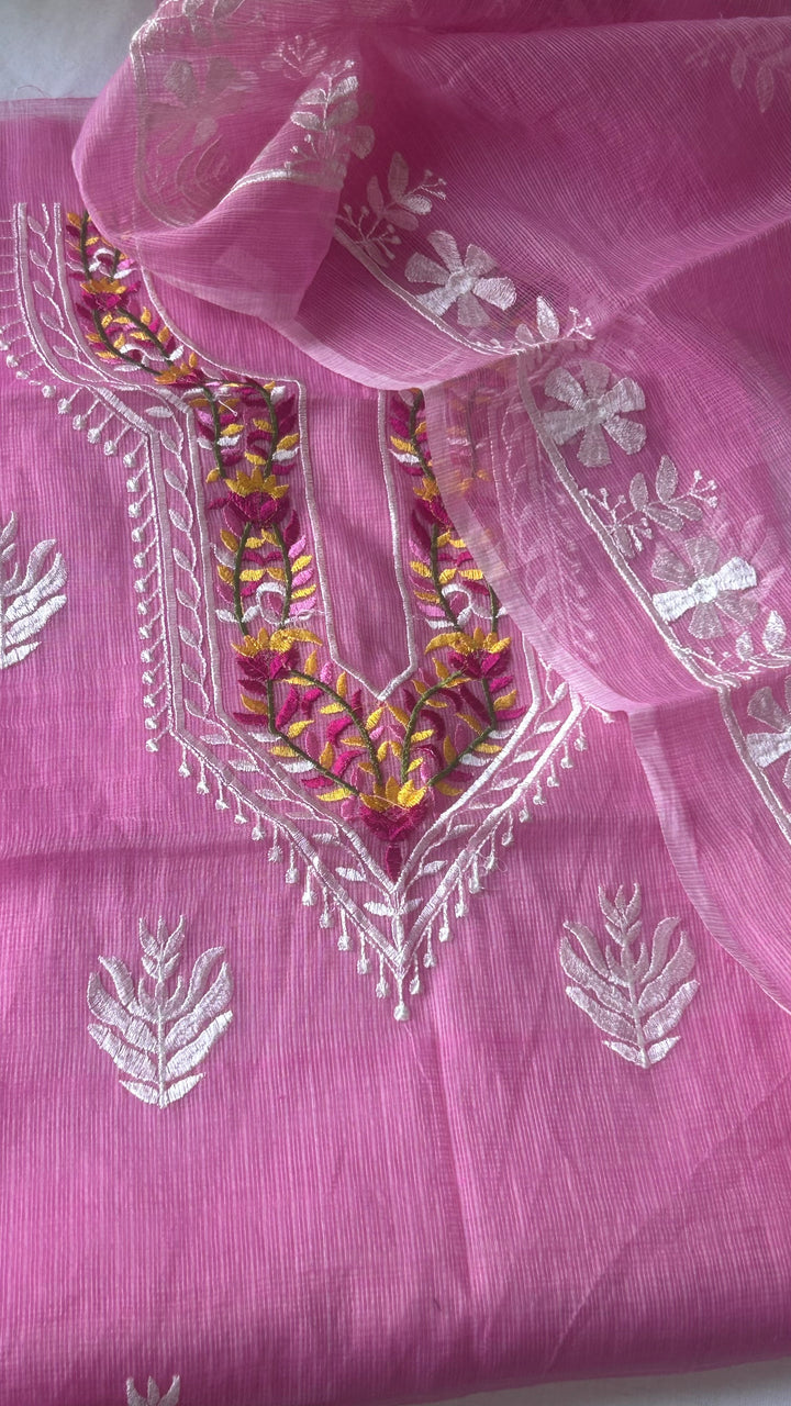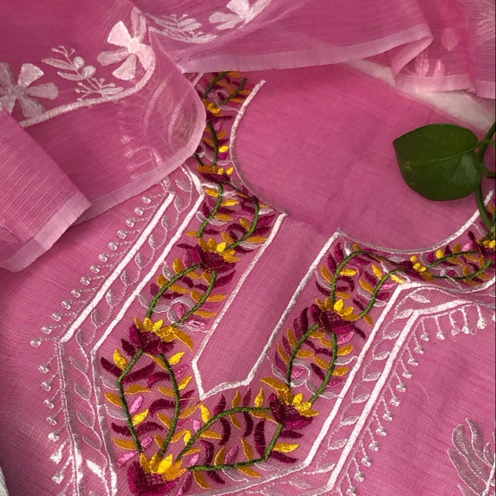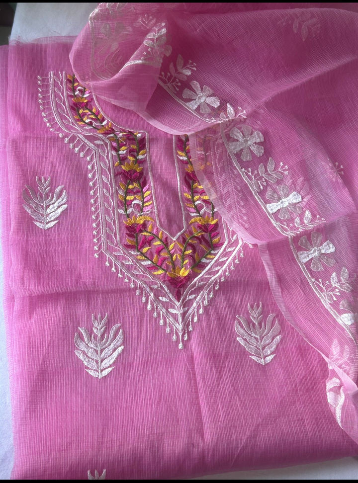 Rati- Beautiful Kota Doriya Embridery Work Suit In pink. This Traditional Suits 2.5 Mtr Top In Kota ,2.5 Mtr Dupatta In Kota,2.5 Mtr Bottom In Cotton, Wear This Kota Doria Suit With Kundan Necklace And Jhumkas On Day Time Function, This Designer Suit Comes With Beautiful Dupatta That Seems Perfect For Any Occasion,Free Shipping And Cod Available, Shipping Worldwide.