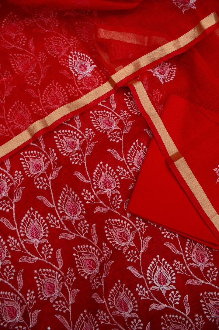 Sitadevi- Beautiful Kota Doriya Embridery Work Suit In Red. This Traditional Suits 2.5 Mtr Top In Kota ,2.5 Mtr Dupatta In Kota,2.5 Mtr Bottom In Cotton, Wear This Kota Doria Suit With Kundan Necklace And Jhumkas On Day Time Function, This Designer Suit Comes With Beautiful Dupatta That Seems Perfect For Any Occasion,Free Shipping And Cod Available, Shipping Worldwide.