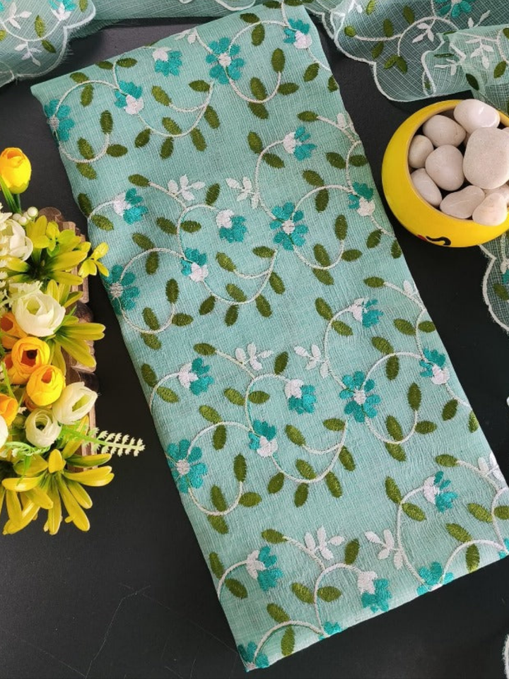 Sumitra- Beautiful Kota Doriya Embridery Work Suit In Sea Green. This Traditional Suits 2.5 Mtr Top In Kota ,2.5 Mtr Dupatta In Kota,2.5 Mtr Bottom In Cotton, Wear This Kota Doria Suit With Kundan Necklace And Jhumkas On Day Time Function, This Designer Suit Comes With Beautiful Dupatta That Seems Perfect For Any Occasion,Free Shipping And Cod Available, Shipping Worldwide.