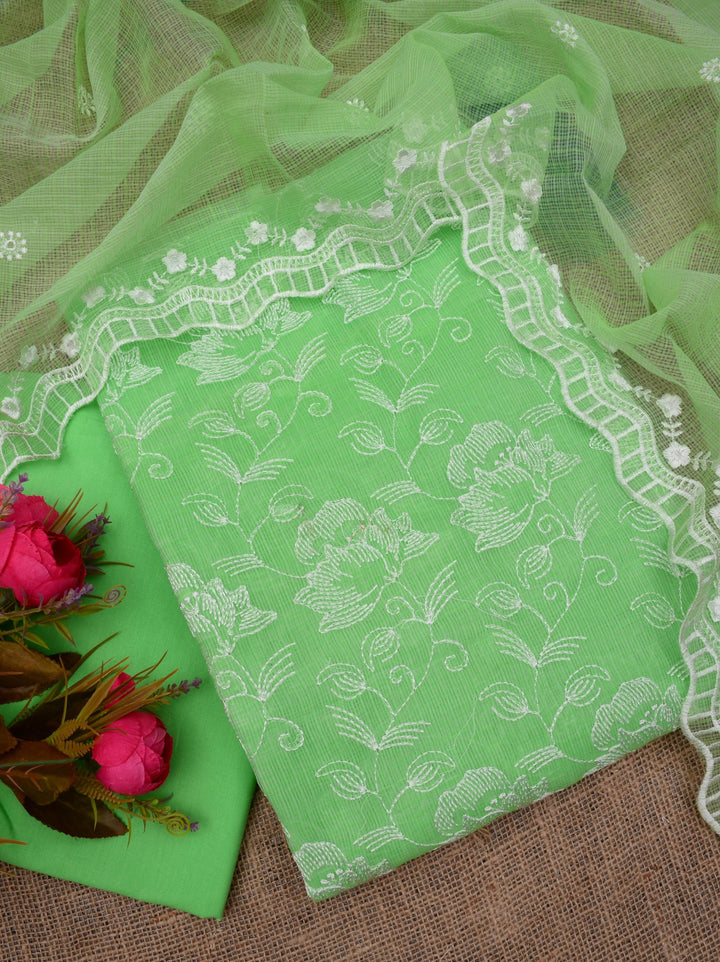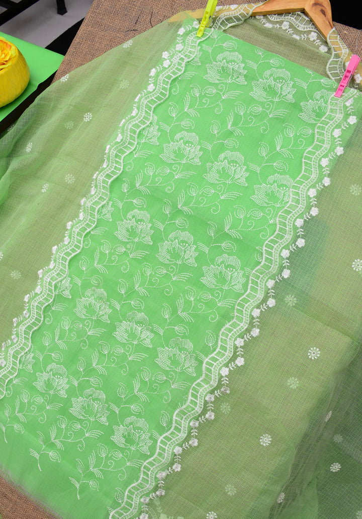 Kaushalya- Beautiful Kota Doriya Embridery Work Suit In Green. This Traditional Suits 2.5 Mtr Top In Kota ,2.5 Mtr Dupatta In Kota,2.5 Mtr Bottom In Cotton, Wear This Kota Doria Suit With Kundan Necklace And Jhumkas On Day Time Function, This Designer Suit Comes With Beautiful Dupatta That Seems Perfect For Any Occasion,Free Shipping And Cod Available, Shipping Worldwide.