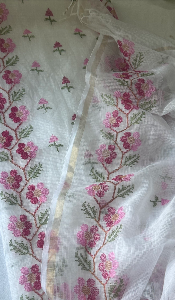 Vaidehi- Beautiful Kota Doria Suit In White Colour With Pink Embroidery Work