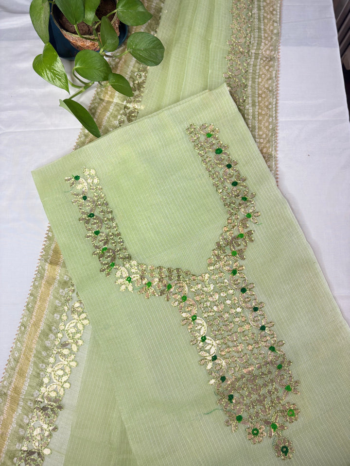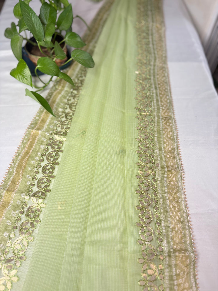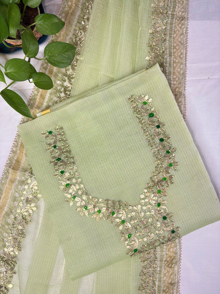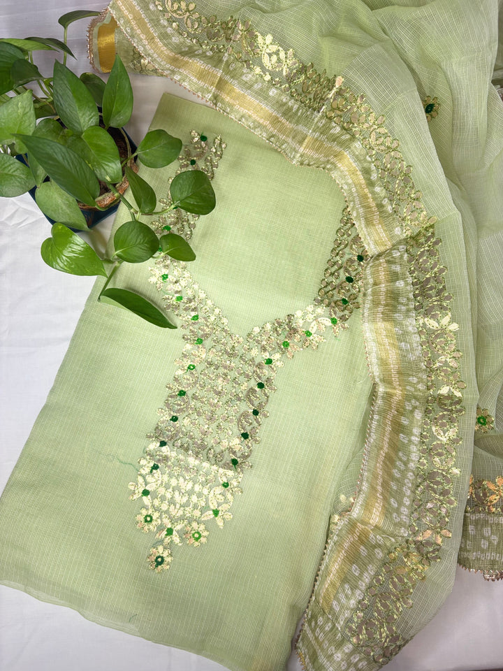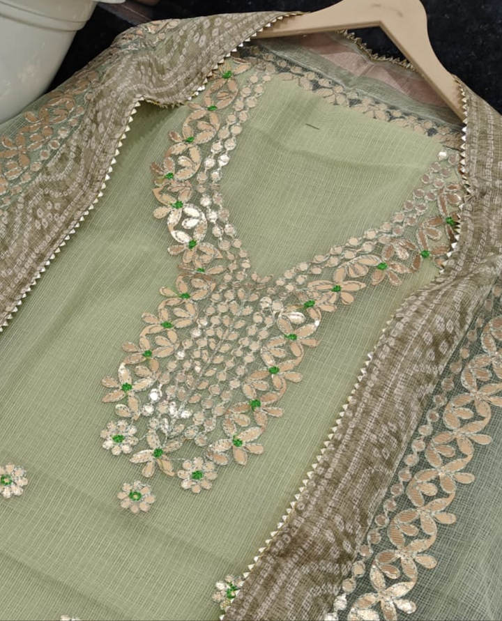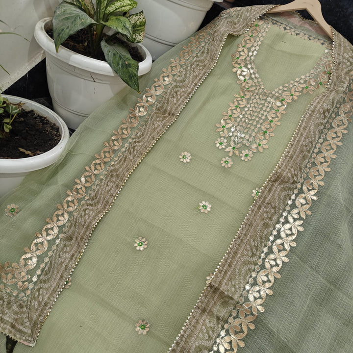 Devyani- Kota Salwar Suit In Gota Work In Pastel Green This Traditional Suits 2.5 Mtr Top In Kota ,2.5 Mtr Dupatta In Kota,2.5 Mtr Bottom In Cotton, Wear This Kota Doria Suit With Kundan Necklace And Jhumkas On Day Time Function, This Designer Suit Comes With Beautiful Dupatta That Seems Perfect For Any Occasion,Free Shipping And Cod Available, Shipping Worldwide.